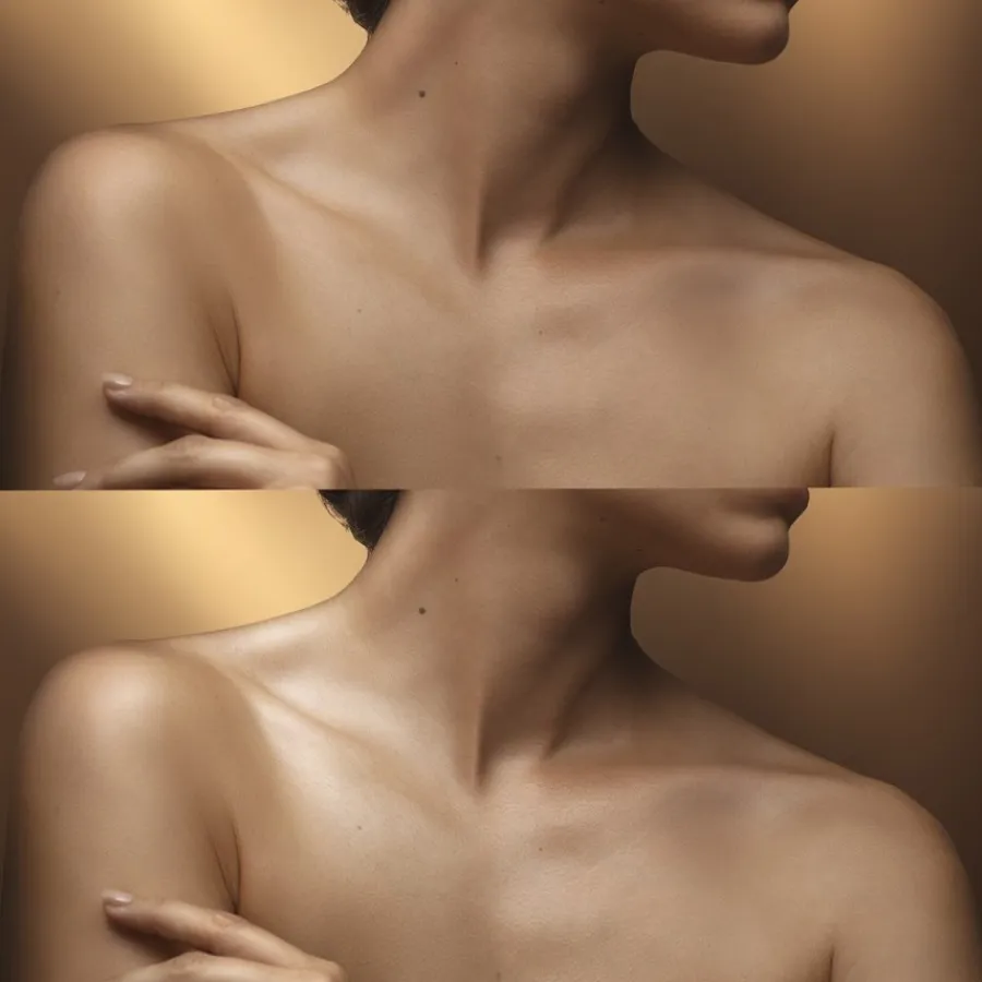 Glijd naar buiten langs het sleutelbeen en masseer van de schouder naar de nek.