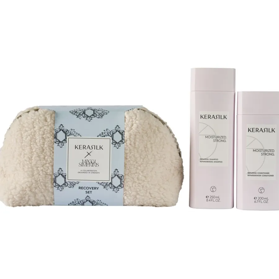 De Kerasilk Essentials Recovery Set wordt gepresenteerd in een exclusieve editie die is ontworpen als een “Maggie Simpsons Co-Collaboration Grounded in Strength” en combineert hoogwaardige verzorging met een stijlvol accessoire. De Reawakening Shampoo en Reawakening Conditioner zitten in een rechthoekige, pluizige tas in een crèmekleur, met beide flessen in een delicate roze tint. De formules zijn gebaseerd op Biomimetische Zijde en Hyaloveil® en zijn speciaal ontwikkeld voor droog, beschadigd of gebleekt haar. Deze ingrediënten zijn gericht op het visueel heropbouwen van de haarstructuur, waarbij de elasticiteit kan worden ondersteund door regelmatig gebruik. De geharmoniseerde producten zorgen ervoor dat het haar soepel aanvoelt en makkelijker doorkambaar is. De routine wordt afgerond met de Kerasilk Care Signature geur, die frisse noten van bergamot en appel combineert met bloemige jasmijn en kruidige amber. Ingrediënten zoals sulfaten, siliconen, minerale oliën en kleurstoffen zijn volledig afwezig in de volledig veganistische formules.
