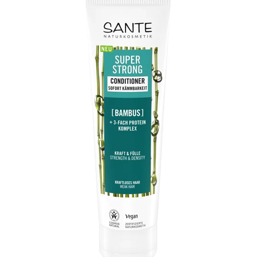 Sante Natural Cosmetics Super Strong Conditioner vermindert haarbreuk en gespleten haarpunten. Het haar ziet er gezond en mooi uit. Het hydraterende complex voegt body toe, voedt het haar en geeft dof, breekbaar haar ongelooflijke veerkracht. Natuurlijk en krachtig – dat zijn de toverwoorden van Sante natuurlijke cosmetica, want alle ingrediënten zijn van natuurlijke oorsprong en afkomstig van gecertificeerde biologische teelt. Deze conditioner is vrij van siliconen, minerale oliën en oppervlakteactieve stoffen en biedt vegan haarverzorging zonder compromissen.Breng de conditioner aan op vochtig haar na het wassen. Masseer de Sante Super Strong Conditioner zachtjes in de lengtes van je haar en spoel het na een korte inwerktijd grondig uit. Na deze extra haarverzorging kan het haar zoals gewoonlijk gestyled worden.