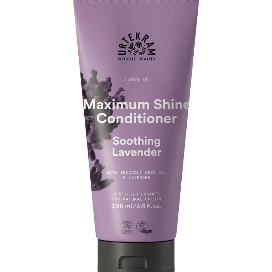 De Soothing Lavender Maximum Shine Conditioner van Urtekram geeft het haar een magische glans en gaat pluizig haar tegen. Het maakt het haar zacht en soepel en optimaliseert de doorkambaarheid. De formule is geschikt voor alle haartypes. Het bestaat voor 99% uit ingrediënten van natuurlijke oorsprong en is vrij van parabenen, microplastics en synthetische conserveringsmiddelen. Breng na het wassen een hoeveelheid conditioner ter grootte van een walnoot aan in vochtig haar en spoel het na een korte inwerktijd grondig uit. Ervaar glad, levendig en heerlijk geurend haar met een schitterende glans!