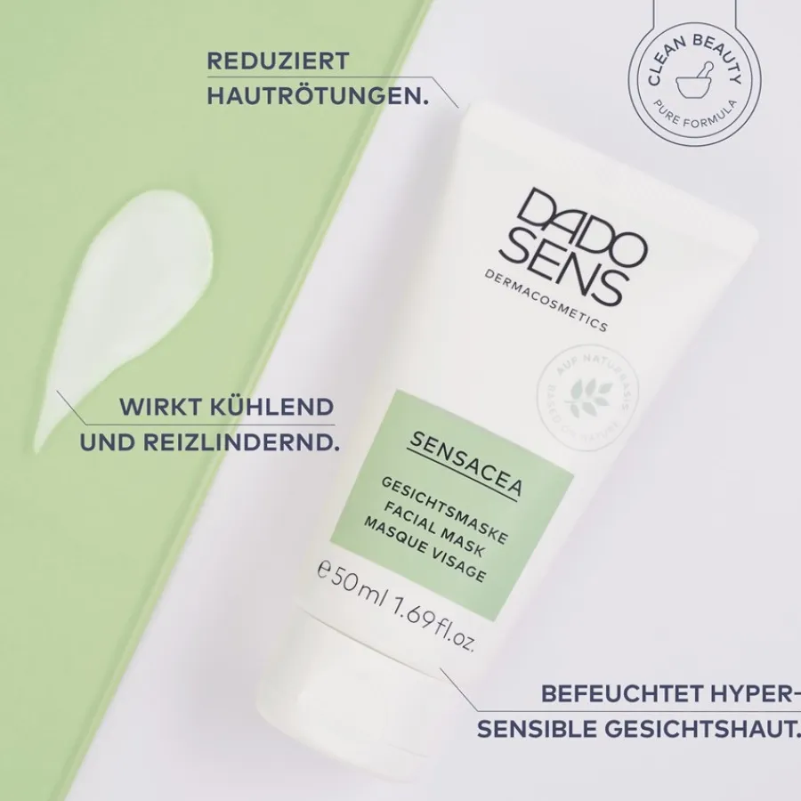 Sensacea gezichtsverzorging van DADO SENS wordt optimaal verdragen en is uiterst effectief. Het bevat geselecteerde actieve ingrediënten zoals allantoïne, aloë vera, zoethoutwortelextract en panthenol, die de geïrriteerde huid snel en betrouwbaar kalmeren en ontspannen. We raden aan om het gezichtsmasker twee tot drie keer per week te gebruiken, of vaker indien nodig. Je kunt het masker het beste combineren met andere producten uit de Sensacea-lijn om je huid precies de verzorging te geven die ze nodig heeft.