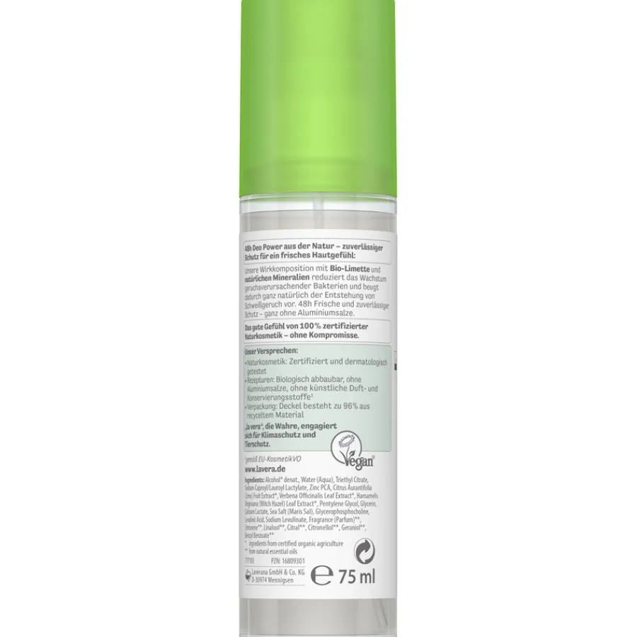 De Natural & Refresh deodorantspray uit het lichaamsverzorgingsassortiment van Lavera is vrij van schadelijke aluminiumzouten en geeft je langdurige frisheid met behulp van natuurlijke ingrediënten. De deodorant bevat mineralen die afkomstig zijn van zeewater en geurveroorzakende bacteriën in zweet verminderen. Etherische olie, die wordt gewonnen uit biologisch geteelde limoenen, heeft een revitaliserende werking en verzorgt de huid dankzij de antioxidanten die het bevat. Toverhazelaarwater heeft een verzachtende en hydraterende werking en voorkomt irritatie.De lichaamsverzorgingsproducten van Lavera zijn veganistisch en gecertificeerd natuurlijk en biologisch. De ingrediënten die worden gebruikt om de deodorants te maken zijn grotendeels afkomstig van regionaal geteelde planten van duurzame teelt en bevatten geen stoffen die schadelijk zijn voor de gezondheid zoals kunstmatige geurstoffen, kleurstoffen, conserveringsmiddelen of siliconen. De deodorantverpakking is ook op een grondstofbesparende manier geproduceerd: Het grootste deel is gemaakt van recyclebare materialen en is biologisch afbreekbaar.