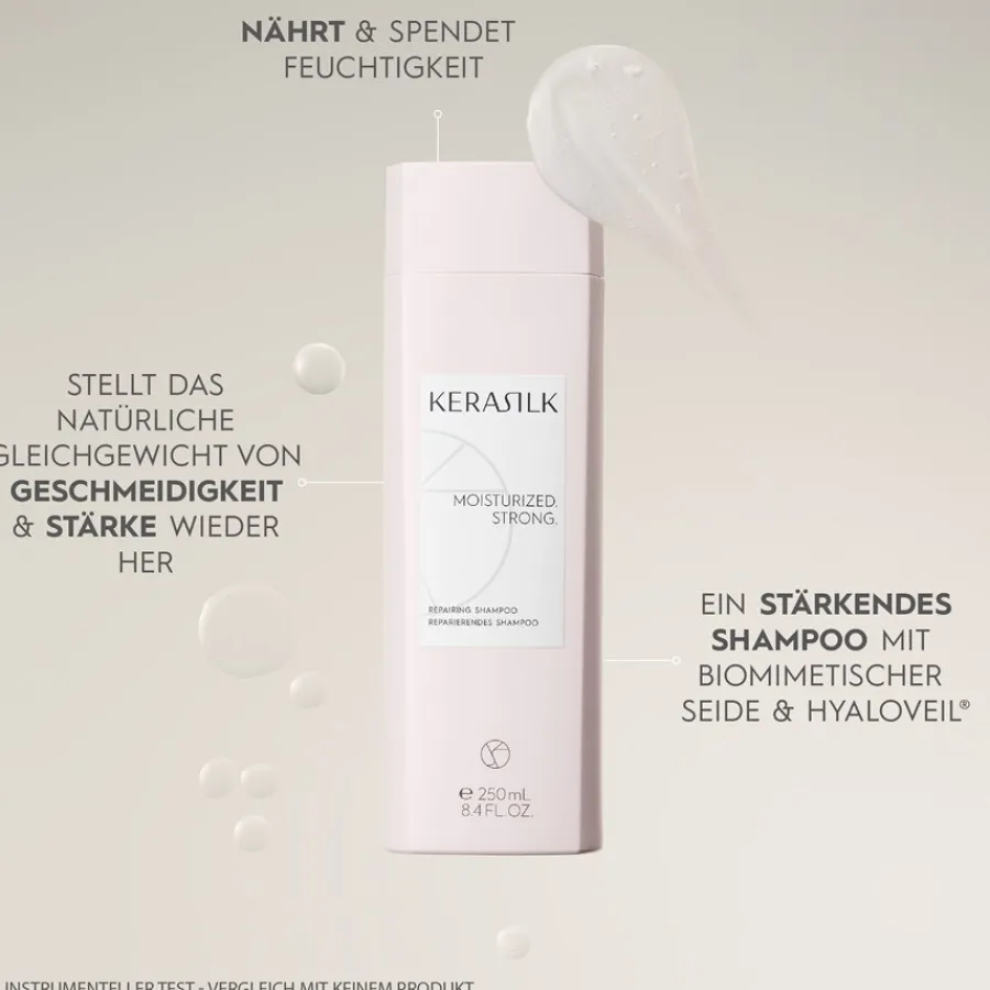 De zachte formule van Kerasilk Essentials, die zijn herstellende shampoo ook heeft verrijkt met versterkende plantenextracten, is waardevol voor het haar. Het doel van deze textuur is om vuil, oliën, verontreinigingen en andere opbouw grondig te verwijderen zonder ruwe en broze haarvezels verder te belasten. Zorgdoel 2 is een evenwichtige conditie van de haarstructuur, die nu beter beschermd is tegen mechanische, thermische en chemische belasting. We raden aan om tussendoor te wassen om kleur te herstellen die vervaagd is door ruwe haarstructuren.Kerasilk Essentials wordt gebruikt door alle vrouwen met droog haar of haar dat de neiging heeft droog te worden. Dankzij de milde samenstelling is de Repairing Shampoo uit deze verzorgingslijn ideaal voor dagelijks gebruik. Zelfs de geïrriteerde, broze, schilferige en allergiegevoelige hoofdhuid wordt gekalmeerd en tijdens het schuimen voorzien van rijke micronutriënten en vocht. De optimale staat van natuurlijke balans is zichtbaar in de soepele valling van het haar, de gemakkelijke doorkambaarheid en de vitale kracht.