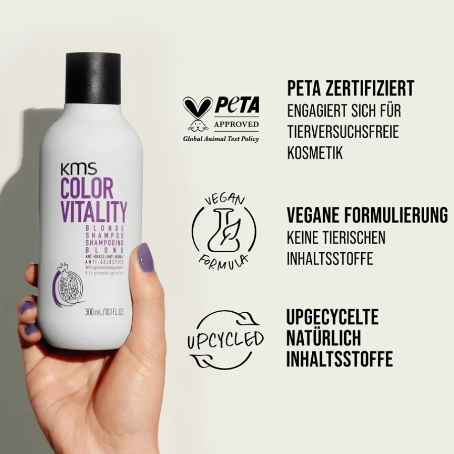 De Colorvitality Blonde Shampoo van KMS geeft blond haar een intense glans vanaf het eerste gebruik, zodat je zelfs enkele dagen na de kleuring nog met plezier naar je nieuwe look in de spiegel kunt kijken. Dit wordt mogelijk gemaakt door speciale kleurreflexen die in het haar worden ingebracht, waardoor de glansopbouw effectief wordt bevorderd. Bovendien bestrijdt de KMS Colorvitality Blonde Shampoo zichtbaar ongewenste geeltinten in gebleekt en gehighlight haar en in natuurlijk blond haar. Om te gebruiken masseer je de shampoo voor gekleurd haar gewoon in gewassen en nog vochtig haar en op de hoofdhuid, waar je het even laat inwerken. Daarna grondig uitspoelen met warm water en indien gewenst het proces herhalen.
