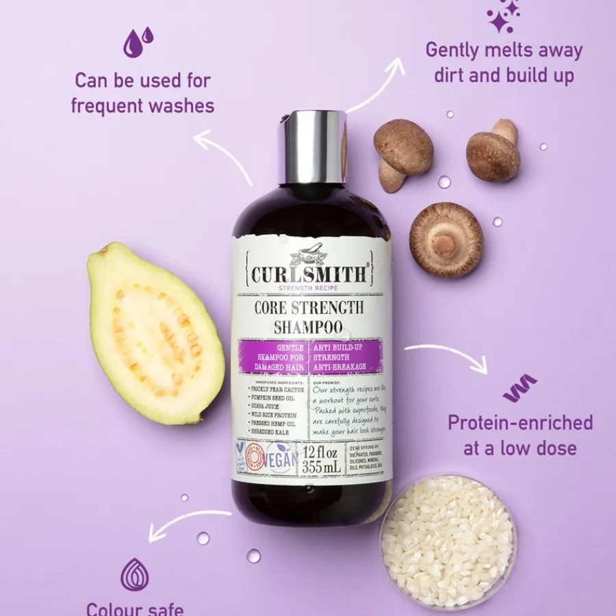 De eerste stap in een grondige haarverzorging is het kiezen van de juiste shampoo. Curlsmith ontwikkelde Shampoo & Co-Wash speciaal voor de hoge eisen van krullend haar. Een co-wash routine is echter niet geschikt voor elk haartype. Fijn en vet haar vraagt om verzorgingsproducten die het niet te zwaar maken. De Core Strength Shampoo gebruikt bijzonder zachte ingrediënten en reinigt het haar zonder het te ontdoen van zijn natuurlijke oliegehalte. De shampoo is verrijkt met proteïnen en voedende actieve ingrediënten en beschermt en versterkt het haar tijdens de dagelijkse shampoobeurt. Om te gebruiken gewoon een kleine hoeveelheid op de hoofdhuid aanbrengen, goed inmasseren en vervolgens uitspoelen.