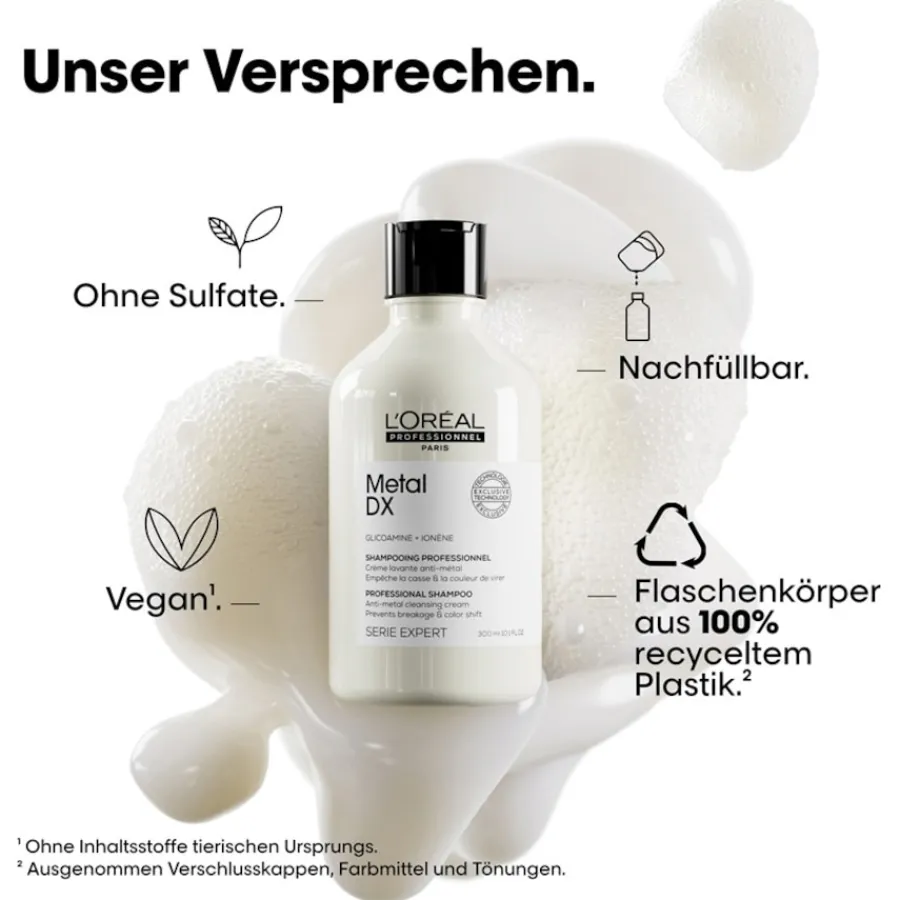 L’Oréal Professionnel Serie Expert Metal DX Professional Shampoo is speciaal ontwikkeld als een effectief haarverzorgingsproduct voor intensieve kleurbescherming vóór de volgende toepassing in de salon. Het voedt en verzacht het haar, behoudt de natuurlijke glans en zorgt ervoor dat de kleurbriljantie van je kleuring of ontkleuring aanzienlijk langer meegaat. Een bijpassende conditioner van dezelfde fabrikant is verkrijgbaar in onze online shop. Breng de shampoo aan op het haar en emulgeer tot er een rijk schuim ontstaat. Kort laten inwerken en daarna grondig uitspoelen.
