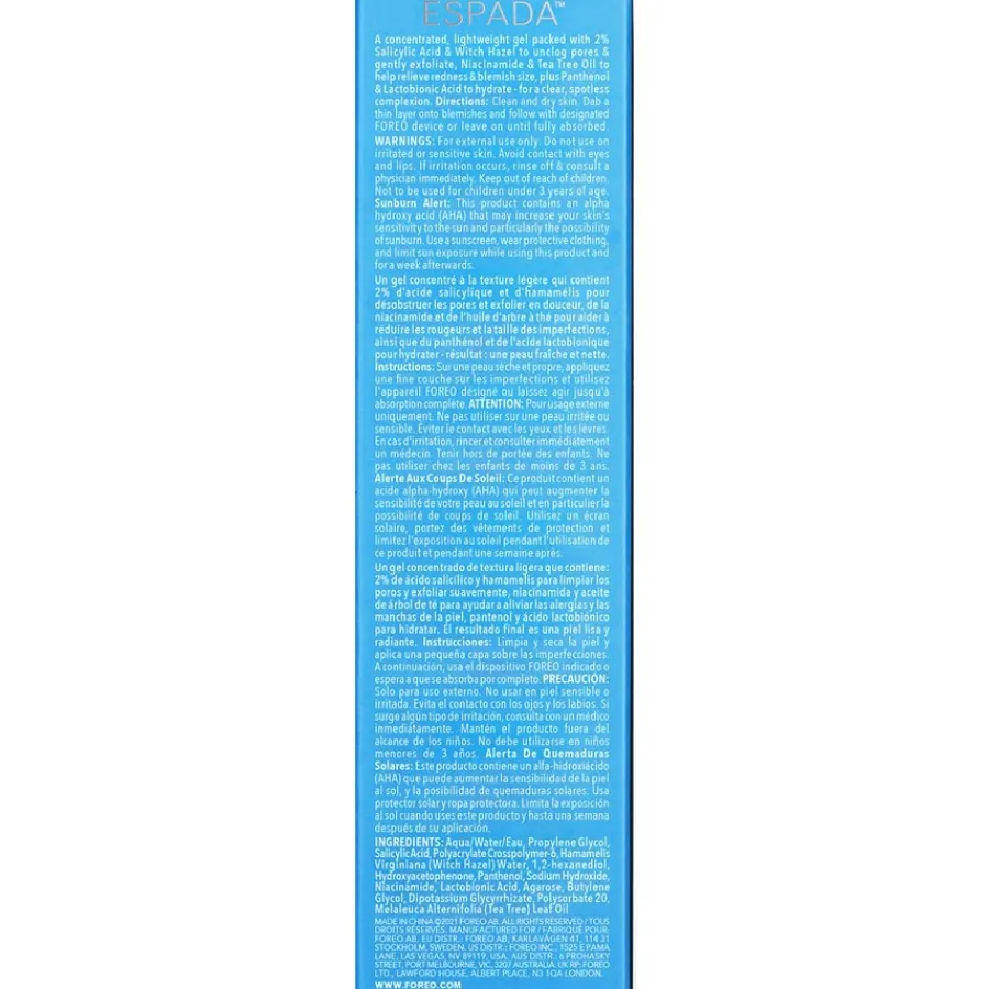 – Breng een dun laagje van de gel direct op de onzuiverheden aan en laat het inwerken tot het volledig is geabsorbeerd. Het aanbrengen met het FOREO ESPADA™ apparaat versterkt het effect.