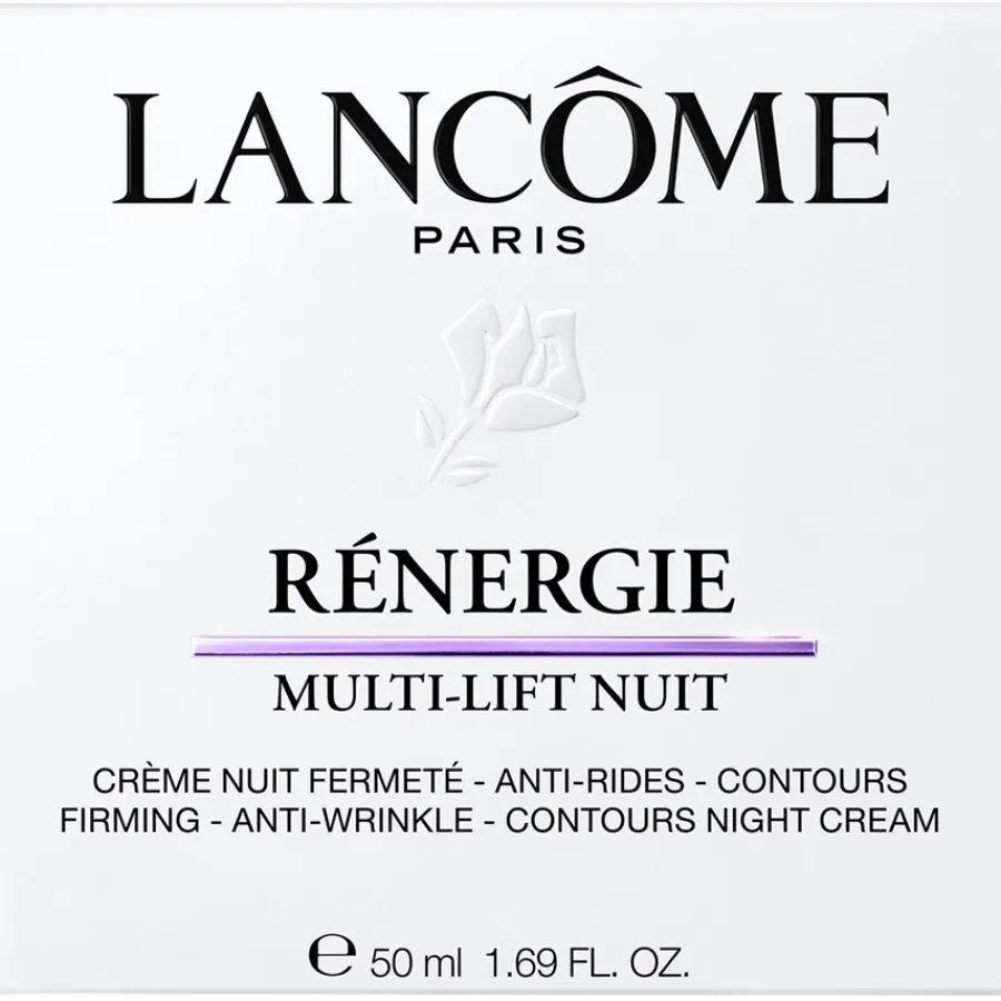 Lancôme’s Rénergie Nuit Multi-Lift is een nachtcrème die speciaal is ontwikkeld om te voldoen aan de behoeften van de rijpere huid. De formule is gebaseerd op multi-tension technologie en is ontworpen om de huid ’s nachts te ondersteunen. Bij regelmatig gebruik kan de huid steviger aanvoelen en kunnen de gezichtscontouren meer gedefinieerd lijken. De crème is geschikt voor verschillende huidtypes en wordt geleverd in 50 ml. Voor de avondroutine wordt de textuur aangebracht op de gereinigde huid en met zachte opwaartse bewegingen ingemasseerd. Door de huid daarna licht te kneden kan het huidverzorgingsritueel worden afgerond. In een zelfevaluatie van 49 vrouwen, uitgevoerd door Lancôme, werd het gevoel van een stevigere huid op het voorhoofd, in de nek en rond de ogen beschreven na enkele weken gebruik.
