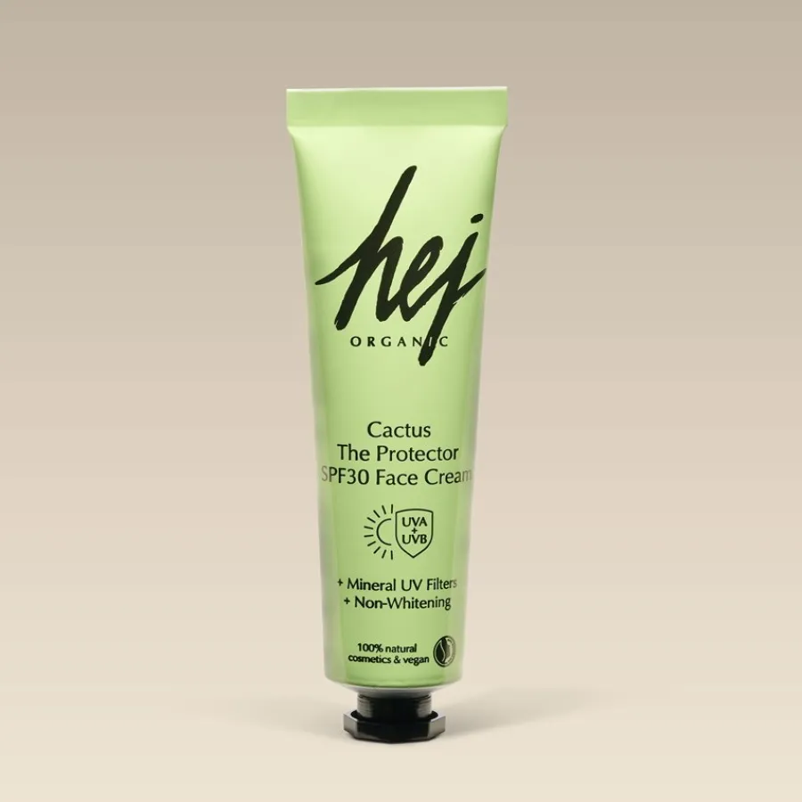 Zon betekent welzijn en leven – maar als het ongefilterd op de huid valt, kan het leiden tot schade, ziekte en vroegtijdige veroudering. Zelfs bij bewolkt weer zijn er schadelijke UV-stralen aanwezig en The Protector Face Cream SPF30 Cactus biedt effectieve bescherming tegen deze stralen. Het is een minerale zonnecrème met een hoge beschermingsfactor van 30 en werkt op natuurlijke en chemische wijze tegen UV-stralen.De crème van Hej Organic geeft je huid een ontspannen gevoel, verfrist de teint en heeft een aangename citrusgeur. Hij smeert gemakkelijk uit en wordt snel opgenomen zonder een plakkerig laagje achter te laten. Hej Organic huidverzorging is verrijkt met waardevolle stoffen zoals vijgvijgzaadolie, vitamine C en hyaluronzuur. Deze hebben een intensief hydraterend, antioxidant en verstevigend effect. Verheug je op een jeugdig stevige, gezond uitziende en beschermde huid!