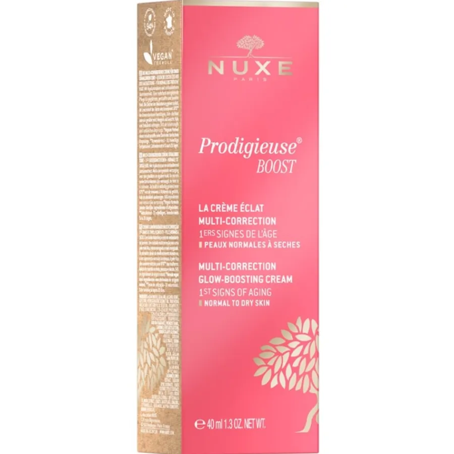 De Crème Prodigieuse Boost Multi-Correctie Zijdezachte Crème bevat zorgvuldig geselecteerde ingrediënten die de ruwe en gestreste huid haar natuurlijke balans teruggeven. Het is verrijkt met hyaluronzuur, macadamiaolie en jasmijnbloesem. Boost Multi-Correction Silky Cream van Nuxe is niet alleen verrukkelijk door de lichte, subtiel smeltende textuur, maar ook door de sprankelende geur, die doet denken aan wit hout en sappige lychees. Deze gezichtsverzorging wordt zowel ’s ochtends als ’s avonds op de gereinigde huid aangebracht. Indien gewenst kan het gecombineerd worden met een primerlotion.