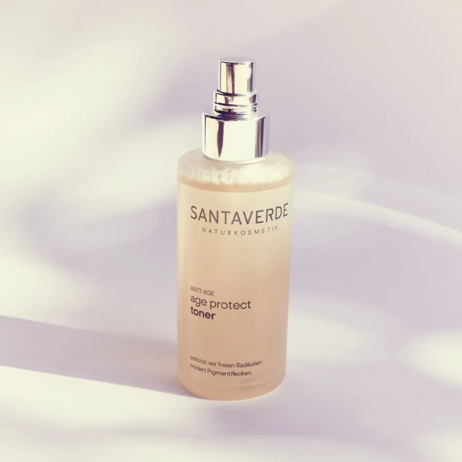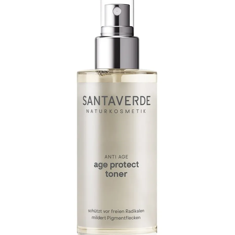 De Santaverde AGE PROTECT Toner vult de dagelijkse huidverzorgingsroutine aan met een doelgerichte formule. Het is gebaseerd op puur aloë vera sap, dat de huid hydrateert. De samenstelling is bovendien verrijkt met extracten van aloë vera bloemen en rockrose bladeren. Deze plantaardige ingrediënten staan bekend om hun antioxiderende eigenschappen. De toner is geschikt voor verschillende huidcondities, waaronder een droge, rijpere en gevoelige huid. Hij is gemakkelijk aan te brengen dankzij de spraykop en laat een aangenaam gevoel achter op de huid. De veganistische formule is verpakt in een slanke, transparante fles die de heldere inhoud zichtbaar maakt.
