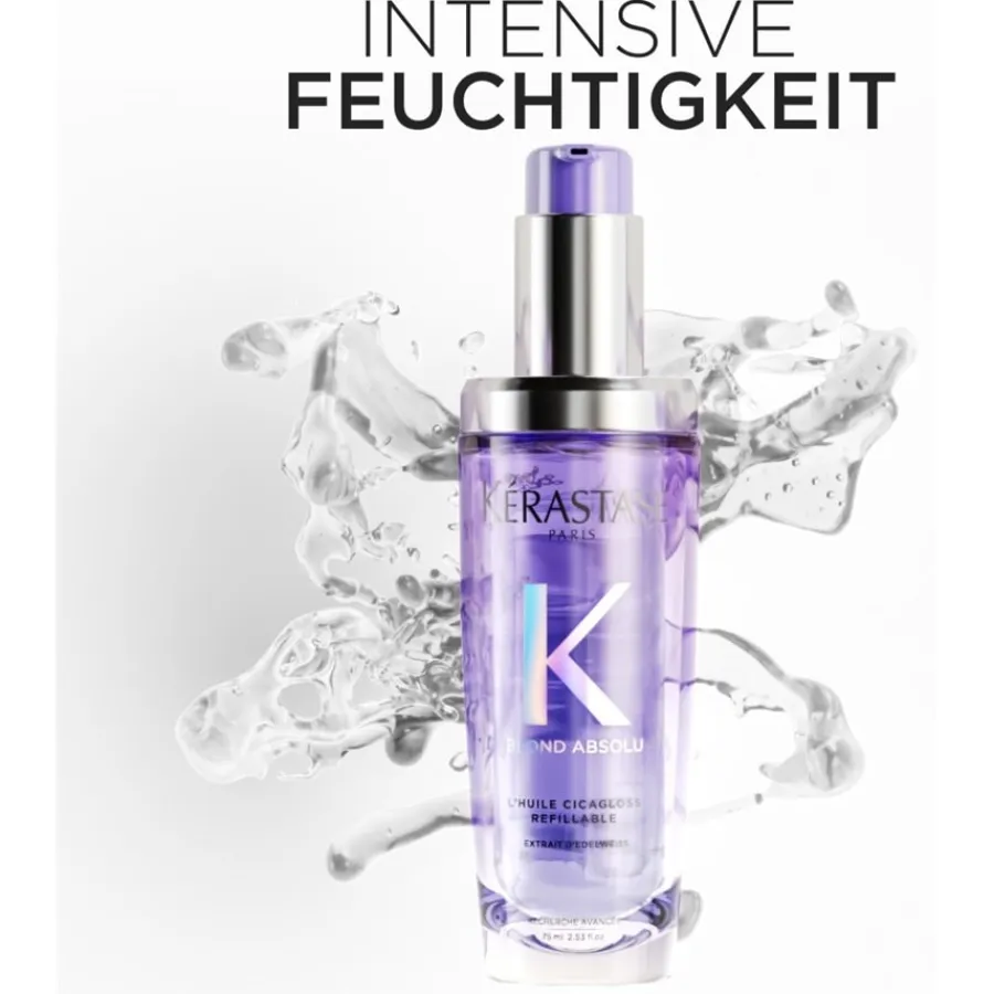 Blond Absolu is ontwikkeld om blond haar, geverfd of natuurlijk, te helpen een ideale kleurtoon te krijgen. Ongewenste kleurreflecties worden tegengegaan. L’Huile Cicagloss van Kérastase biedt de perfecte hittebescherming en hydrateert het haar. De uitgelezen ingrediënten die elke haarstructuur helpen, dragen hieraan bij. Eén of twee pompjes zijn genoeg om de juiste hoeveelheid voor één toepassing te krijgen. Blond Absolu L’Huile Cicagloss wordt aangebracht op droog haar of haar dat nog vochtig is na het wassen en gelijkmatig verdeeld van de lengten tot de punten. Uitspoelen is niet nodig, het stylen kan direct beginnen na de behandeling met dit speciale haarverzorgingsproduct.