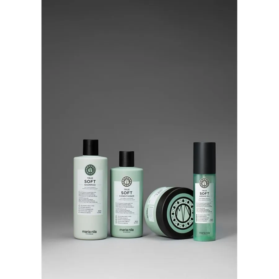 Zachtheid en gladheid voor droog haar De True Soft Argan Oil van Maria Nila heeft een verweneffect als lotion & olie. Het wordt snel door het haar opgenomen en is perfect voor droog haar. Het haar wordt onmiddellijk intensief gehydrateerd en versterkt. De haarvezel wordt gladder en pluis verdwijnt op betrouwbare wijze. Dankzij het kleurbeschermingscomplex wordt het haar beschermd tegen beschadiging door zonnestralen en kan het vervagen van de haarkleur – natuurlijk of gekleurd – worden verminderd. De toevoeging van parabenen, sulfaten en dierlijke ingrediënten is vermeden ten gunste van de hoofdhuid en het haar. Het resultaat is een onweerstaanbare soepelheid en een gezonde glans.De haarolie is gemakkelijk in gebruik: een kleine hoeveelheid van de olie wordt zorgvuldig in het haar gemasseerd van de wortels tot de punten. Na het aanbrengen moet het haar drogen zonder verdere actie.