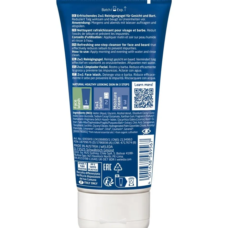 Je kunt de Weleda FOR MEN 2in1 Face Wash huidverzorging natuurlijk elke dag gebruiken – indien nodig zelfs twee keer per dag. Dankzij de speciale formule droogt Weleda FOR MEN 2in1 Face Wash huidverzorging het gezicht niet uit tijdens het reinigen, terwijl de geltextuur het ook gemakkelijk maakt in gebruik. De revitaliserende geur garandeert een goed begin van de dag, terwijl de voedende extracten de huid verwennen tijdens het reinigen. De cleanser bevat hazelnoot- en zoethoutwortelextracten, evenals wilgenbastextracten. Ze hebben allemaal verzachtende en voedende eigenschappen en zijn ook in staat om de talgproductie in de poriën te normaliseren. Geschikt voor alle huidtypes.