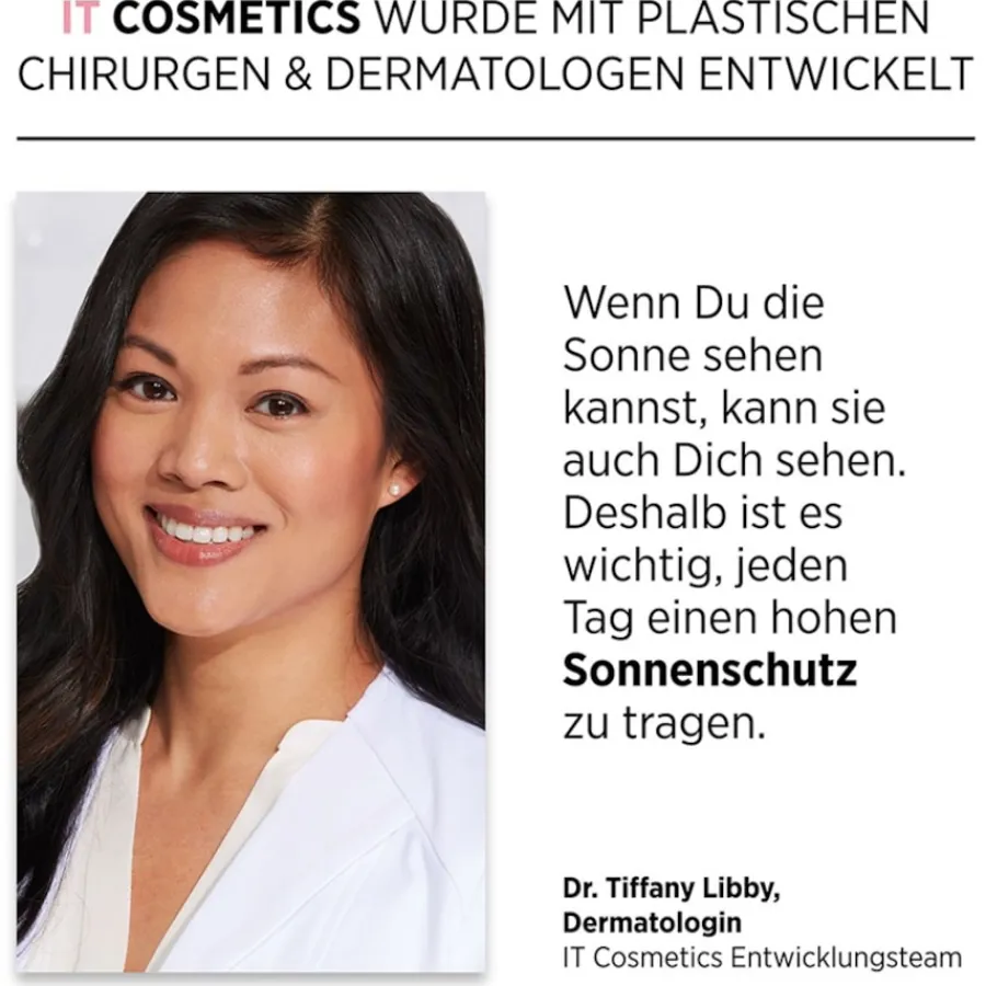 De Your Skin But Better CC+ Cream SPF 50+ van it Cosmetics is een multifunctioneel product dat de eigenschappen van een foundation combineert met kleurcorrigerende pigmenten en een hoge beschermingsfactor tegen de zon. De formule biedt een volledige dekking die onregelmatigheden, roodheid en pigmentvlekken op betrouwbare wijze camoufleert zonder zich in fijne lijntjes te nestelen. Het zorgt voor een egale teint en laat een natuurlijk stralend resultaat achter. De romige textuur, verrijkt met een complex van niacine, peptiden, gehydrolyseerd collageen en hyaluronzuur, laat de huid soepel aanvoelen. De geïntegreerde zonbeschermingsfactor 50 beschermt de huid tegen UV-A- en UV-B-straling. De olievrije formule is geformuleerd zonder parabenen, paraffines of microplastics en is daarom ook geschikt voor de vette of puistgevoelige huid. Dankzij de consistentie is de CC cream gemakkelijk aan te brengen en te blenden en kan het gebruikt worden als veelzijdige make-up basis of spot concealer.