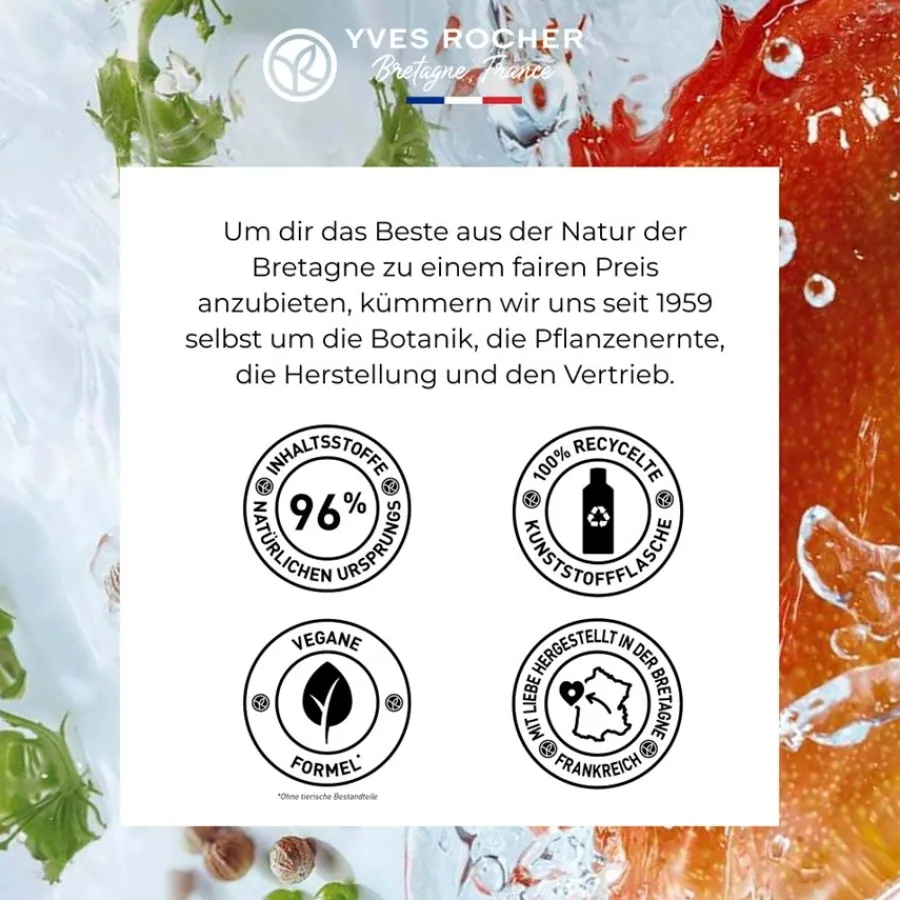 Yves Rocher Research for Plant Cosmetics heeft voor deze lijn twee bijzondere geurcomponenten gecombineerd: Koriander en mango. Koriander staat bekend om zijn vitaliserende eigenschappen. De rijke etherische olie van koriander wordt gewonnen uit de bolvormige, knapperige vruchten. De bloemige, kruidige geur en verkwikkende frisheid worden afgerond door de vrolijke, fruitige smaken van mango.