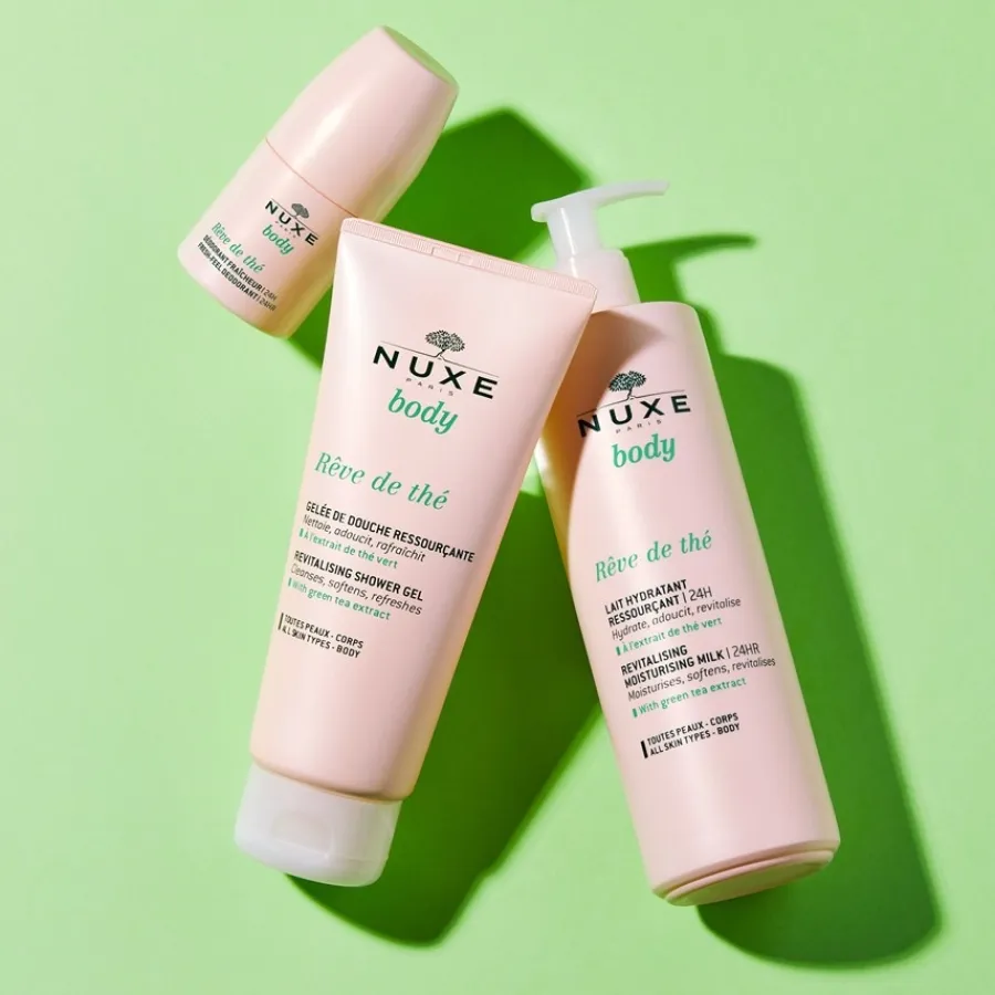 De eersteklas gezichts- en lichaamsverzorging van het merk Nuxe wordt gecreëerd in een laboratorium aan de rand van Parijs. Hier worden innovatieve actieve ingrediënten en formules ontwikkeld, zoals het verrukkelijke groene thee-extract, dat de deodorant zijn frisse geur en voedende eigenschappen geeft. Voor de Rêve de Thé Déodorant Fraîcheur 24h gebruikt het cosmeticabedrijf een puur veganistische formule en ingrediënten die voor meer dan 97% van natuurlijke oorsprong zijn. De producten zijn vaak unisex en populair bij zowel mannen als vrouwen.
