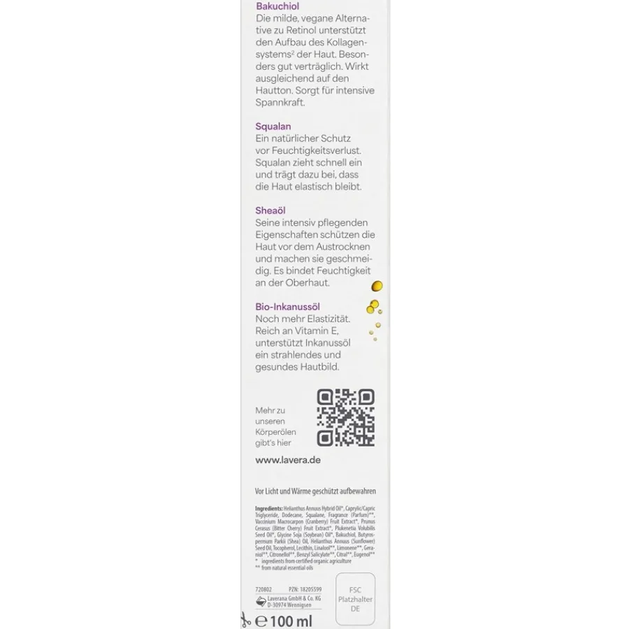 Dit natuurlijke retinol alternatief met bakuchiol en squalaan zorgt voor een gladde teint. Het is fijn dat de olie over het hele lichaam gebruikt kan worden. Voor een optimaal resultaat moet deze lichaamsolie uit de Body Lotion en Milk lijn spaarzaam worden gebruikt en worden aangebracht op een vochtige huid (bijvoorbeeld na het baden of douchen).