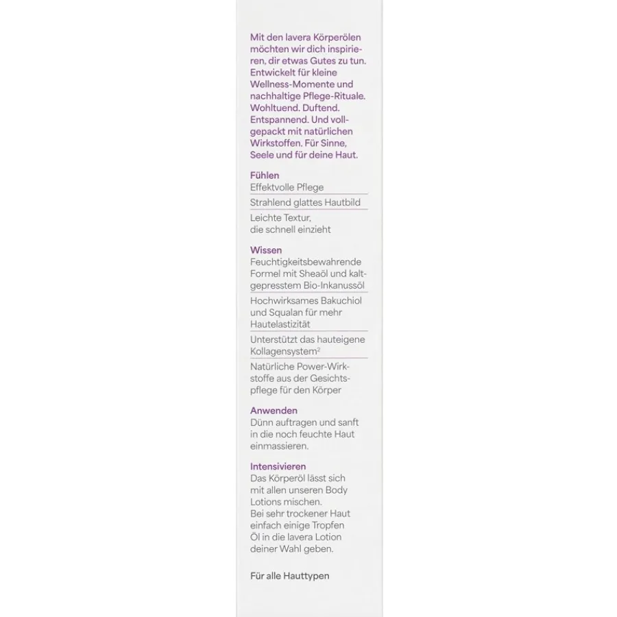 Huidverzorging volgens biologische normen: De beauty body oil van Lavera uit de Body Lotion en Milk lijn biedt dit en nog veel meer. De pompflacon van 100 ml bevat een olie die geschikt is voor alle huidtypes. Naast mensen met een normale huid kunnen ook mensen met een droge huid er baat bij hebben. De beauty body oil is dermatologisch getest en vrij van parabenen en paraffine. Het is ook pH-neutraal, wreedheid-vrij en veganistisch.