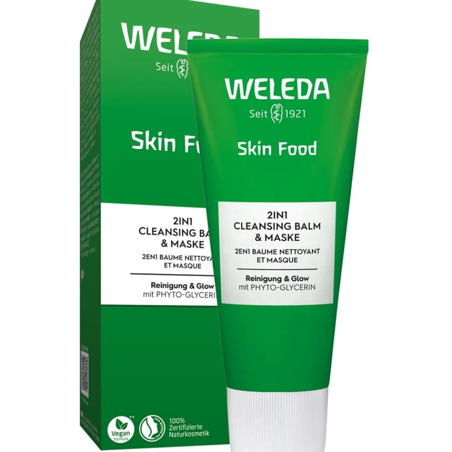 De op olie gebaseerde formule van de Weleda Skin Food 2in1 Reinigingsbalsem & Masker verwijdert op betrouwbare en milde wijze make-updeeltjes en ander vuil, inclusief vuil uit de omgeving. De verzorging, verrijkt met plantenextracten van viooltje, kamille en biologische calendula, heeft ook een kalmerend effect – waardoor het ideaal is voor de gevoelige of snel geïrriteerde huid. De balsem op oliebasis heeft geen invloed op de vochtbalans van de huid en de zo belangrijke huidbarrière blijft onaangetast tijdens het reinigen. Na het reinigen (of gebruik als masker) ziet de huid er stralend en soepel uit – en is ze klaar voor alle andere huidverzorgingsproducten.