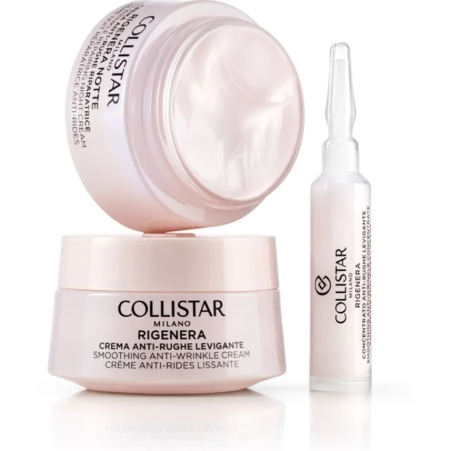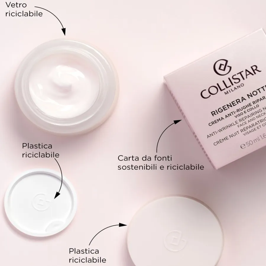 De Rigenera Anti-Rimpel Herstellende Nachtcrème van Collistar activeert diepe celregeneratie en kalmeert huidirritaties veroorzaakt door omgevingsstress. Daardoor gaat het celveroudering tegen. Het vermindert rimpels, voedt de huid en verfijnt de teint. De formule is geschikt voor alle huidtypes. Het is vrij van parabenen, paraffine, minerale olie en siliconen. Het kan worden gebruikt als nachtcrème en als masker. Masseer als nachtcrème elke avond een dun laagje in de huid. Om het als masker te gebruiken, breng je een dikke laag van de textuur aan, laat je het 10 minuten intrekken en verwijder je het. Word ’s ochtends wakker met een jeugdig vollere, stralende huid!