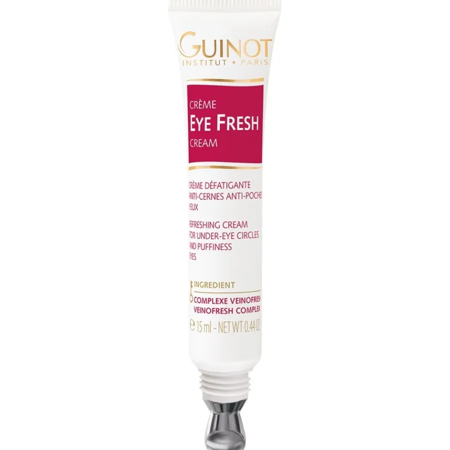 Het actieve ingrediëntencomplex van Guinot’s Eye Fresh anti-aging huidverzorging bevat een formule met Indiase roestkastanje, dermochlorella en cafeïne. Deze unieke combinatie vermindert wallen en donkere kringen onder de ogen door de microcirculatie te stimuleren, vetophopingen af te breken en schadelijke stoffen uit de huid te verwijderen. Het korenbloemextract dat het bevat heeft een verzachtende en drainerende werking, terwijl een hydrocytencomplex vocht bindt en opslaat in de cellen. Tegelijkertijd beschermt het waardevolle avocado-extract tegen schadelijke invloeden van buitenaf, terwijl mangoboter de huid diep voedt. Deze gezichtsverzorging is een effectief wapen tegen een vermoeide uitstraling.Op het gebied van anti-aging verzorging heeft Guinot een breed assortiment producten ontwikkeld voor elk probleemgebied. In onze online shop vind je bijpassende gezichtsverzorgingsproducten die perfect passen bij de Eye Fresh crème.
