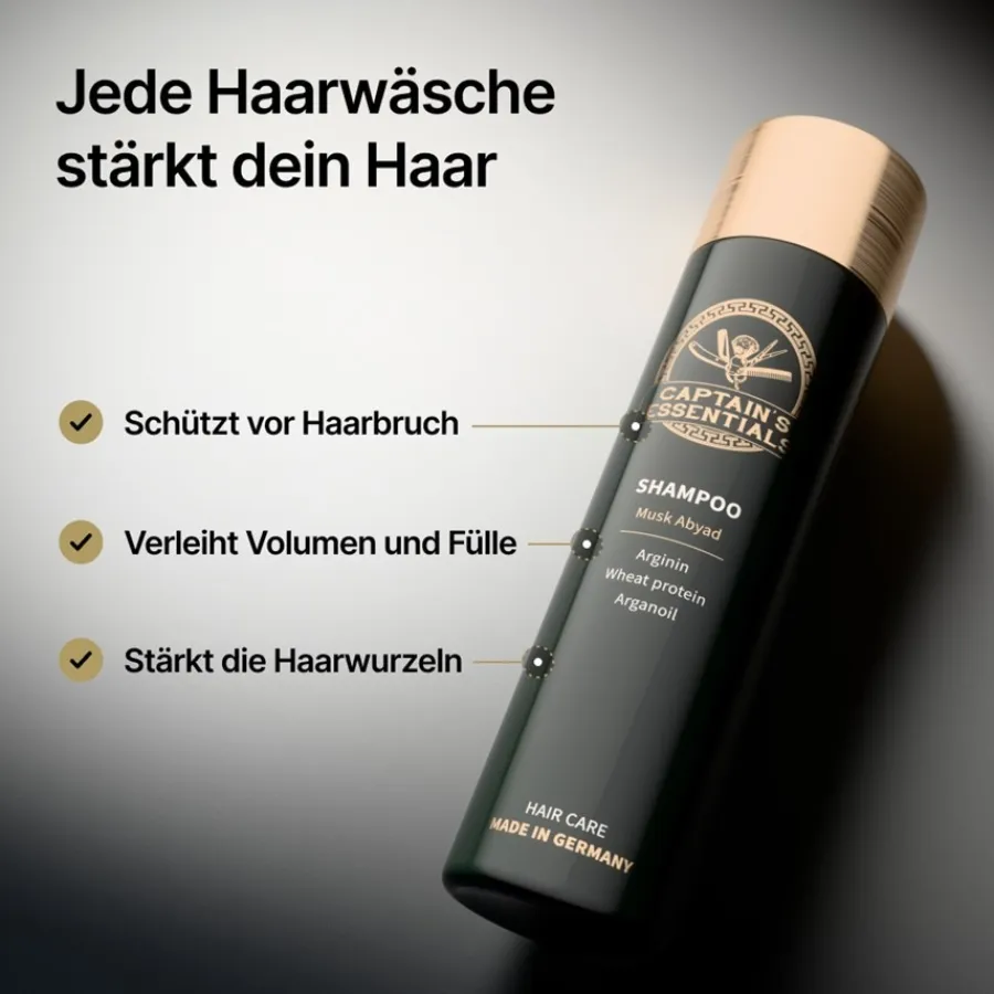 De Captain’s Essentials Musk Abyad Shampoo is een eersteklas haarverzorgingsproduct voor mannen. Omdat mannenhaar zeer speciale verzorging nodig heeft: vaak last van dun en dunner wordend haar, kun je je haar versterken met deze populaire mannenshampoo. Met zijn innovatieve formule zorgt deze haarspoeling voor een sterke en levendige haargroei. De belangrijkste actieve ingrediënten van het haarverzorgingsproduct zijn arginine, tarweproteïne en arganolie. Dit voorziet je haar van alle essentiële voedingsstoffen en de shampoo maakt ook indruk met zijn hoogwaardige grondstoffen en ingrediënten.