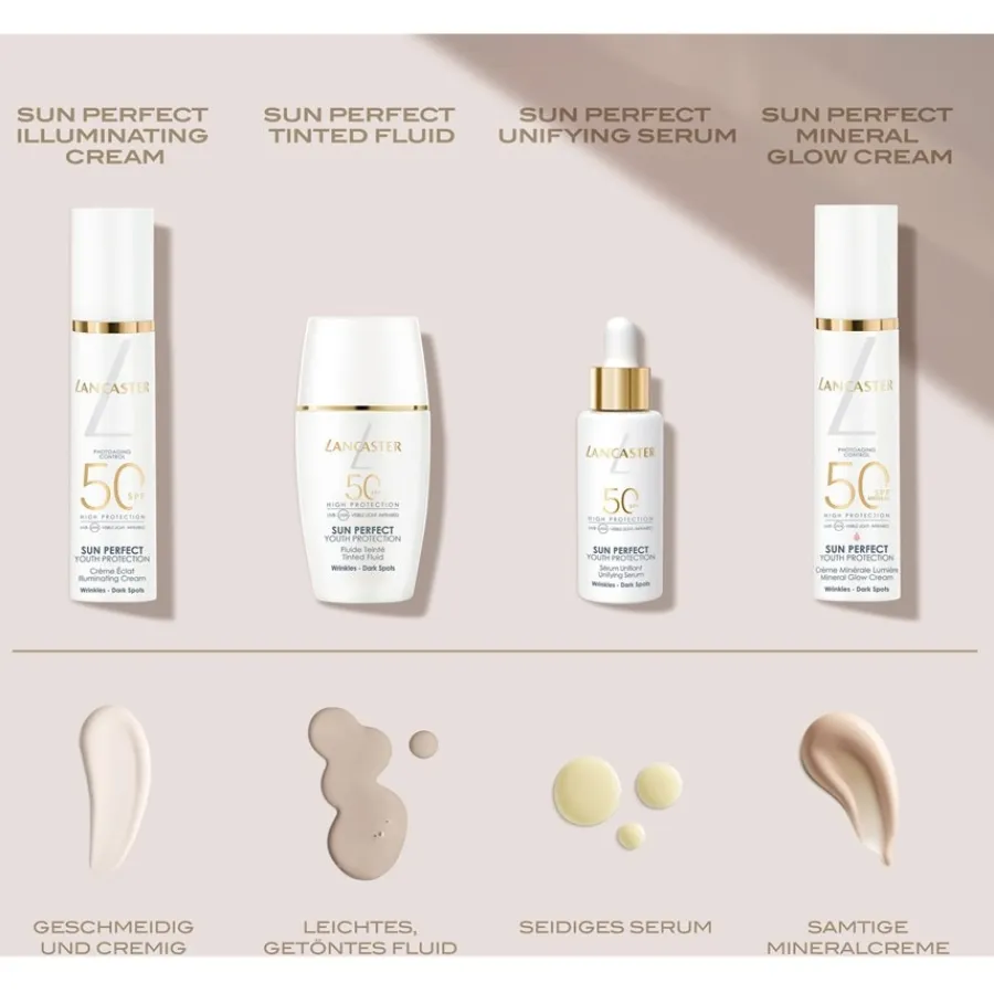 Goede zonverzorging combineert voedende ingrediënten met effectieve zonbescherming: Lancaster heeft met de Sun Perfecting Fluid SPF50 uit de Sun Perfect huidverzorgingslijn een lichte, subtiel getinte fluid gecreëerd. De hoge zonbeschermingsfactor van de Full Light Technology van Lancaster beschermt de huid tegen beschadiging. Op de lange termijn voorkomt dit de vorming van pigmentvlekken en rimpels. De textuur van de fluid is zo licht dat je het niet eens merkt. De delicate tint laat huidimperfecties verdwijnen en het uiterlijk van de huid wordt aanzienlijk verbeterd.</p