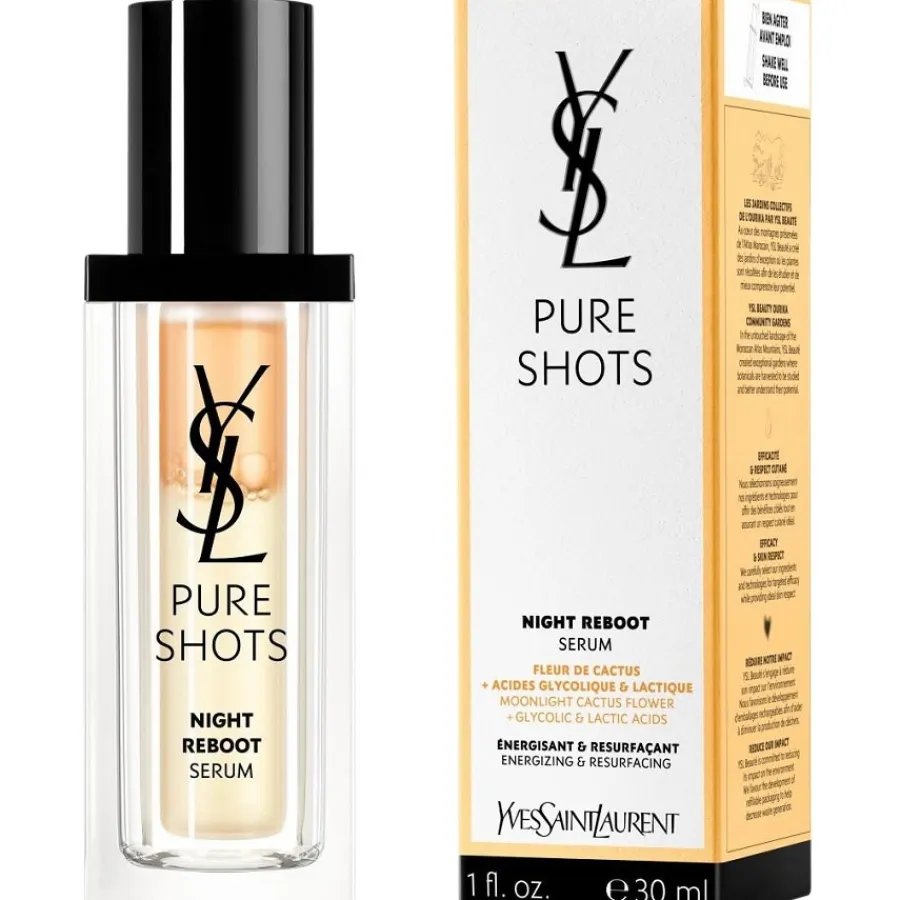 Het Yves Saint Laurent Pure Shots Night Reboot Serum is een tweefasig huidverzorgingsproduct voor de nacht. De formule combineert glycolzuur met extracten van de bloem van de maanlichtcactus uit Marokko. De samenstelling wordt aangevuld met waardevolle oliën, waaronder arganolie. Voor het aanbrengen worden de twee fasen gecombineerd door de fles zachtjes te schudden om een uniforme textuur te creëren. Het serum is geschikt voor verschillende huidtypes en wordt snel opgenomen na het aanbrengen op een gereinigde huid zonder een vettig gevoel achter te laten. De formule bevat geen parabenen, sulfaten of ftalaten. Het product is ook verkrijgbaar in navulbare verpakkingen, wat de duurzame aanpak van het merk benadrukt.</p