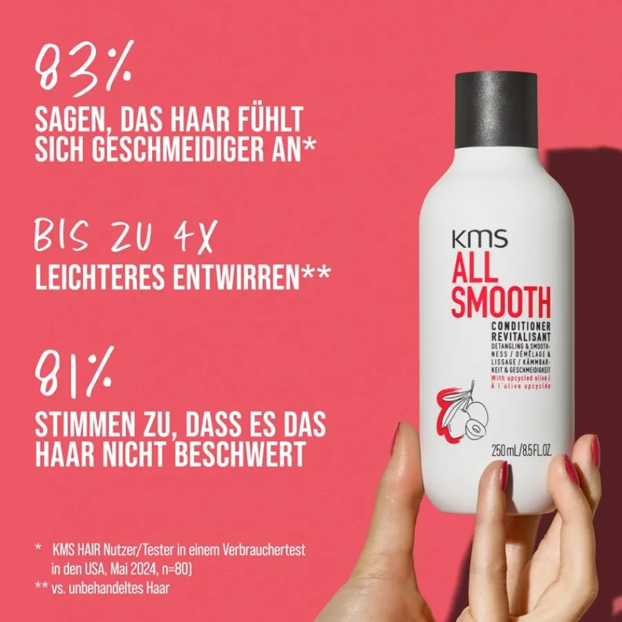 De KMS ALL SMOOTH Conditioner is speciaal ontwikkeld om het haar soepelheid te geven en de doorkambaarheid te verbeteren. De formule, verrijkt met geupcyclede olijf, ondersteunt een glad en zacht haargevoel. Toepassing kan helpen het haar te ontwarren, waardoor het makkelijker te stylen is na het wassen. De conditioner omhult de haarstructuur op milde wijze zonder het te verzwaren en draagt bij aan een verzorgd uiterlijk. Het is geschikt voor regelmatig gebruik om het haar soepel te houden en het een natuurlijke glans te geven.