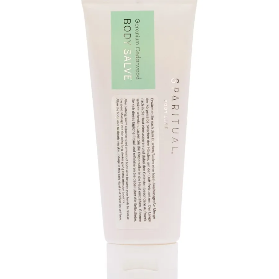 De huidverzorging met Sparitual Body Salve Geranium Cederhout is gebaseerd op hoogwaardige natuurlijke ingrediënten. Sheaboter, cacaoboter en kokosolie zorgen voor een diepe regeneratie van de huid. De huid wordt onmiddellijk merkbaar gladder, soepeler en zachter. Daarnaast helpen de waardevolle mineralen en vitaminen in de natuurlijke oliën je huid te beschermen tegen vrije radicalen en andere schadelijke invloeden van buitenaf. Het product is geschikt voor dagelijks gebruik, wordt snel opgenomen en is niet vet. Verwarm een kleine hoeveelheid in je handen en masseer zachtjes in de huid.