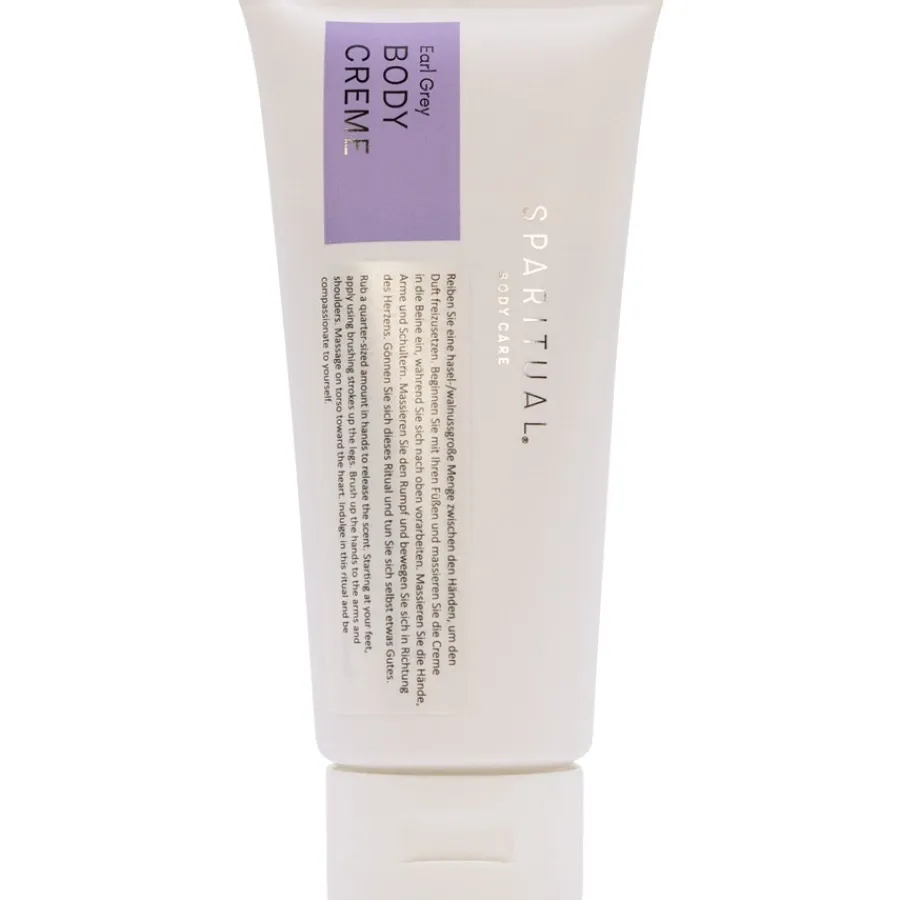 Sparitual’s Earl Grey Body Cream is ideaal voor je dagelijkse huidverzorgingsroutine en kan bijvoorbeeld worden aangebracht na het douchen of scrubben. Giet gewoon een hoeveelheid ter grootte van een hazelnoot in je handpalm, wrijf het in en verdeel het vervolgens over de gewenste lichaamsdelen. Besteed vooral aandacht aan ruwe plekken zoals de ellebogen of knieën.