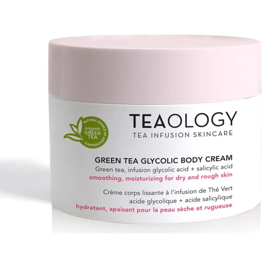 De Green Tea Glycolic Body Cream van Teaology met een infusie van groene thee, glycolzuur en salicylzuur heeft een gladmakend, hydraterend effect op de droge en ruwe huid