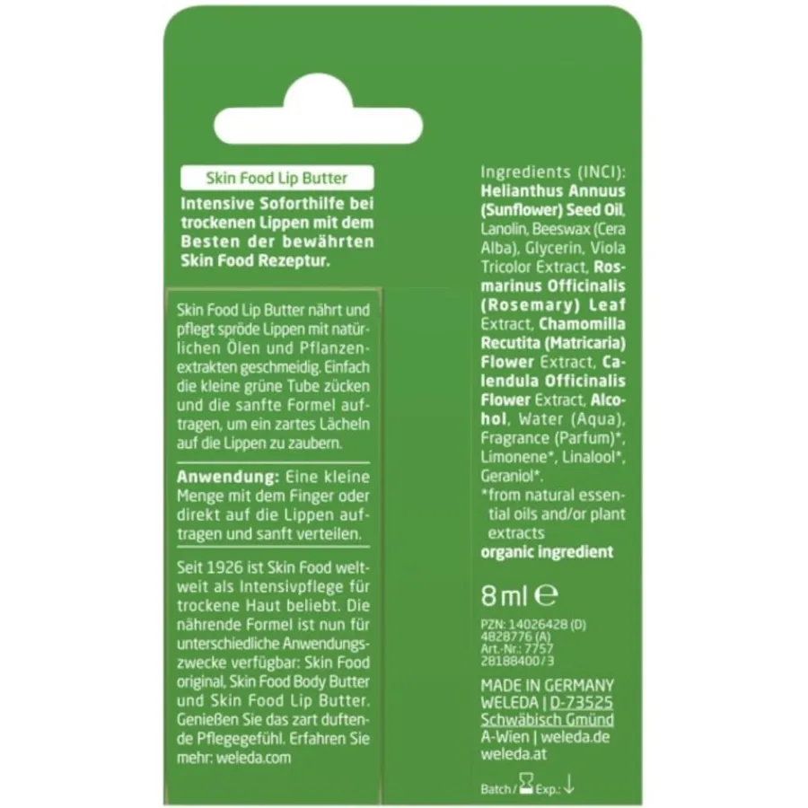 Deze hoogwaardige speciale verzorging voor de droge tot zeer droge huid is niet alleen verkrijgbaar voor het lichaam, maar ook voor de lippen als lippenbalsem. De lippenbalsem uit de “Oog- en Lipverzorging” bevat plantenextracten van kamille, viooltje, calendula en rozemarijn. De combinatie van deze waardevolle plantenextracten met hoogwaardige plantenoliën en bijenwas resulteert in Skin Food Lip Butter voor droge en gesprongen lippen. De cosmeticafabrikant gebruikt ook alleen zuivere ingrediënten die goed worden verdragen voor “oog- en lipverzorging”. De effectieve formule versterkt de huidbarrière van de lippen, hydrateert ze en maakt ze weer soepel.