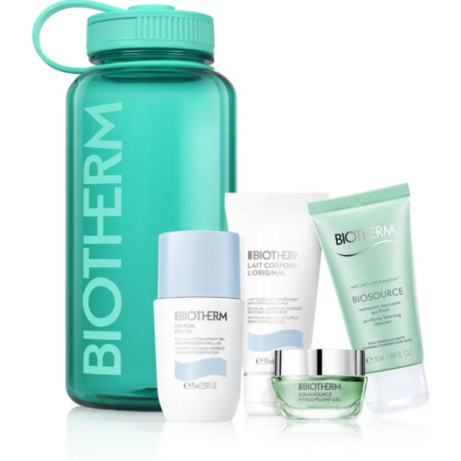 De Biotherm Deo Pure Aqua Drop Set combineert vier producten voor dagelijkse lichaams- en gezichtsverzorging in een handig formaat. De set is samengesteld voor de behoeften van de normale tot vette huid. De set bevat de Deo Pure Roll-On, een deodorant voor dagelijks gebruik. De Biosource Purifying Foaming Cleanser is een schuimende reiniger die gebruikt kan worden om onzuiverheden en make-upresten te verwijderen. Voor het lichaam bevat het de Lait Corporel Lotion met citrusessences, die de huid aangenaam en soepel laat aanvoelen. De gezichtsverzorging wordt afgerond door de Aquasource Hyalu Plump Gel met zijn lichte textuur. Alle producten worden geleverd in reisverpakking in een praktische sportfles, waardoor ze ideaal zijn voor onderweg of op reis.