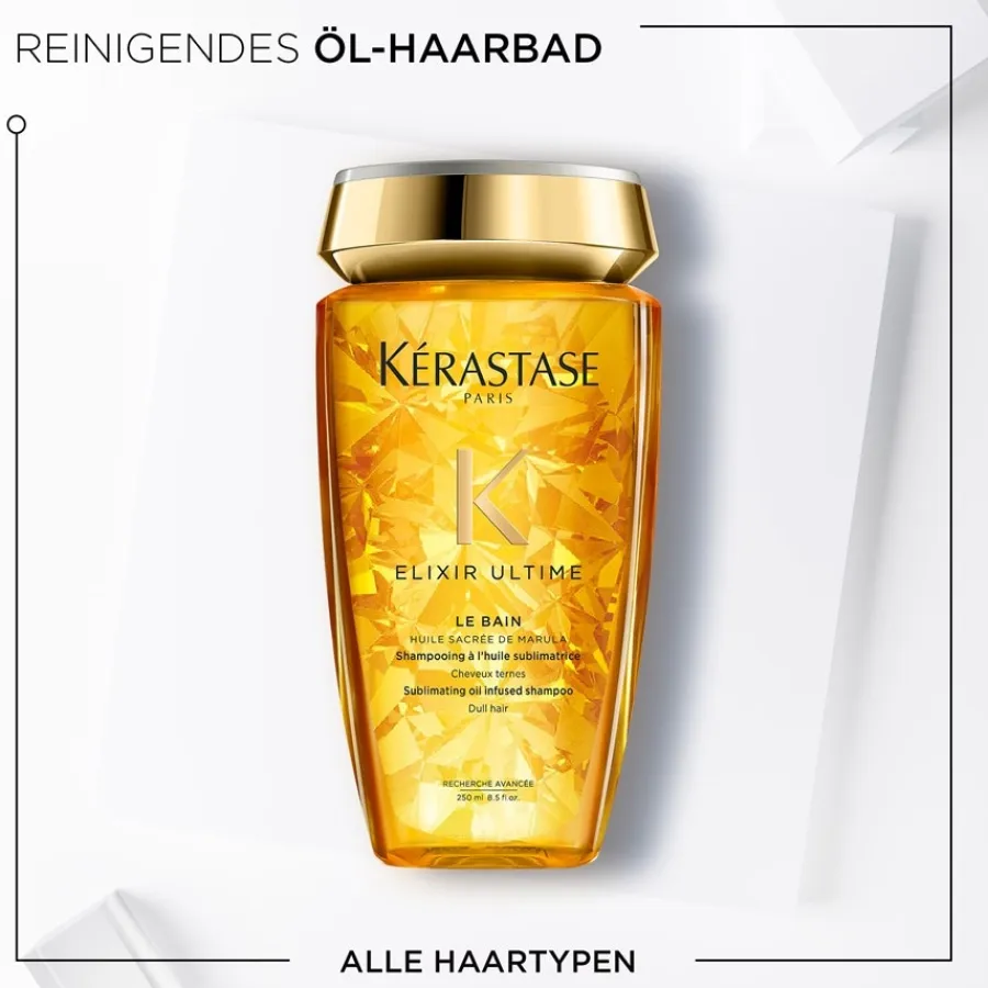 Verwen je haar met Elixir Ultime Le Bain van Kérastase en geniet van het gevoel van zijdezacht en glad haar. Het elixir omhult elke afzonderlijke haar, maakt de haarvezels glad en biedt langdurige bescherming tegen pluis. Tegelijkertijd wordt de haarstructuur gladgestreken. Het licht wordt beter gereflecteerd. Het resultaat is een geweldige zijdeachtige, prachtige glans. De marula-olie die erin zit, zorgt ervoor dat het haar ultralicht aanvoelt en beschermt het dankzij de antioxiderende eigenschappen tegen schadelijke milieu-invloeden. Camilia-olie daarentegen is verantwoordelijk voor de soepelheid en langdurige glans.Andere hoogwaardige verzorgingsproducten zijn verkrijgbaar uit de Elixir Ultime verzorgingslijn van Kérastase, die het haarbad op basis van olie perfect aanvullen.