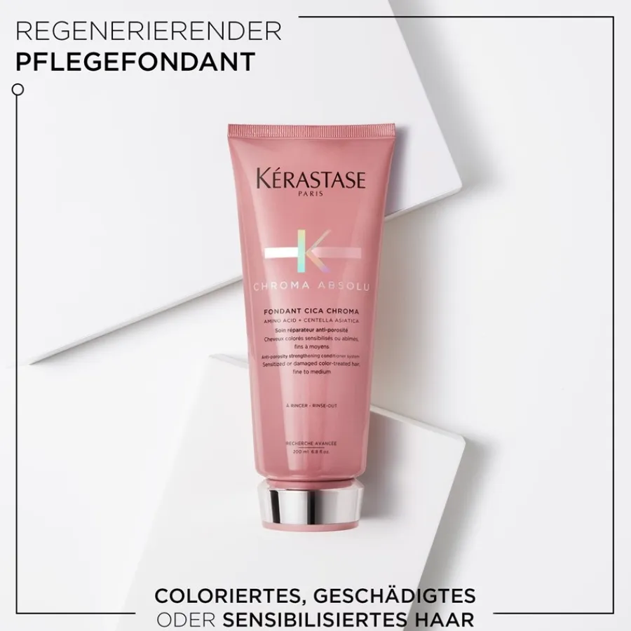 Geef je haar zijn oorspronkelijke glans terug met Fondant Cica Chroma van Kérastase. Voor een optimaal resultaat wordt regelmatig gebruik van het product aanbevolen. Na het wassen aanbrengen op gereinigd en handdoekdroog haar, inmasseren op de lengten en punten en na ongeveer 2 tot 3 minuten grondig uitspoelen. Chroma Absolu Fondant voorziet het haar van waardevolle voedingsstoffen en versterkt de haarstructuur. De soepelheid van de gestresste haarstructuur wordt onmiddellijk verbeterd en het haar is veel gemakkelijker weer doorkambaar. Het resultaat: het haar is onweerstaanbaar glanzend en ongelooflijk glad.
