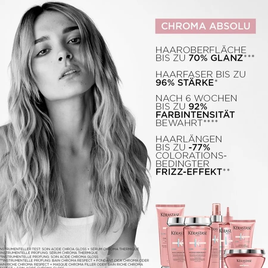 Is je haar erg beschadigd door stylen, kleuren, steilen of föhnen? Is het weerbarstig, mogelijk zelfs pluizig en wil het maar niet in een mooi kapsel worden omgetoverd? Dan moet je dit verhelpen met Serum Chroma Protect! Het beschermt het haar tegen zowel föhnhitte als UV-straling. Het heeft een intensief hydraterend effect en maakt het haaroppervlak glad. Het haar is moeiteloos te stylen, voelt heerlijk glad aan en heeft een zijdeachtige glans.Breng de Chroma Absolu Spray aan op handdoekdroog haar en verdeel het tot in de punten. Vervolgens kun je het aan de lucht laten drogen of föhnen. Het resultaat is een zijdezacht, vol kapsel!