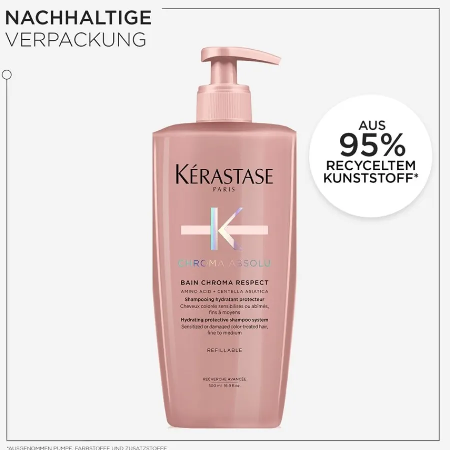 Ook hier laat het bedrijf zien dat haar klanten belangrijk voor haar zijn. De Chroma Absolu navulset bevat een extra verpakking met de Chroma Absolu dispenser, wat helpt om kostbare grondstoffen en geld te besparen. Het haarverzorgingsproduct is met name geschikt voor gekleurd en droog haar, dat extra glans en vocht krijgt door regelmatig gebruik van het product. De toepassing is eenvoudig: afhankelijk van de haarstructuur en -lengte wordt de gewenste hoeveelheid haarverzorging aangebracht op het gewassen, nog vochtige haar. Kérastase Chroma Absolu wordt vervolgens opgeschuimd, ingemasseerd en na een korte inwerktijd met veel water uitgespoeld. Daarna wordt de gebruikelijke styling voortgezet.