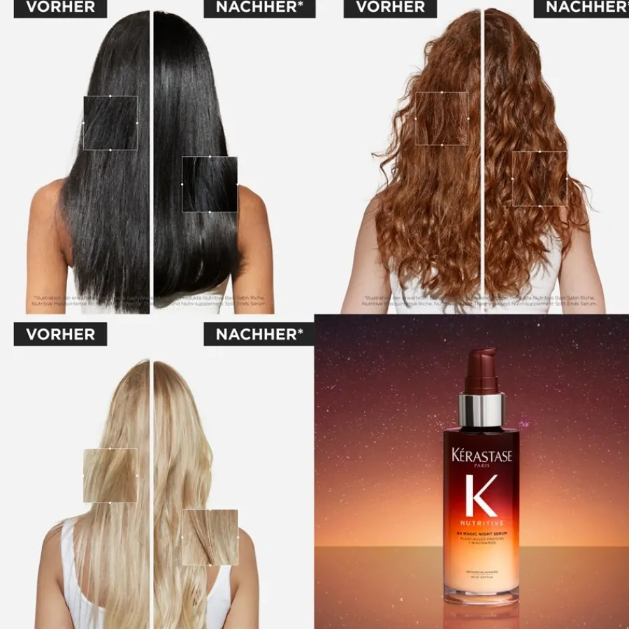 Het Nutritive 8H Magic Night Serum van Kérastase hydrateert het haar diep en revitaliseert het ’s nachts. Het herstelt, ontwart en regenereert de haarvezel. De lichte textuur wordt ’s nachts geabsorbeerd en laat het haar ’s ochtends glad en gewichtloos aanvoelen. Het is de ideale keuze voor droog en beschadigd haar. Breng 1 tot 2 pompjes van het serum aan op je handpalmen en verdeel het gelijkmatig over de lengten en punten. Laat het ’s nachts inwerken en ervaar zijdezacht, glad haar met een gezonde glans in de ochtend!