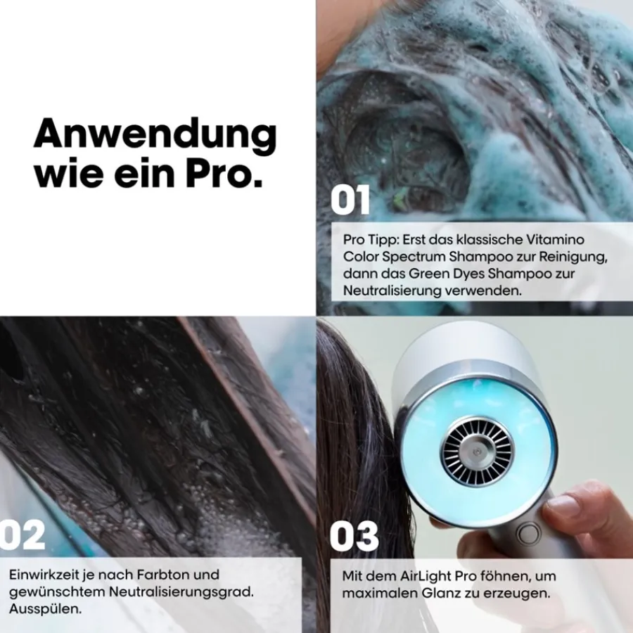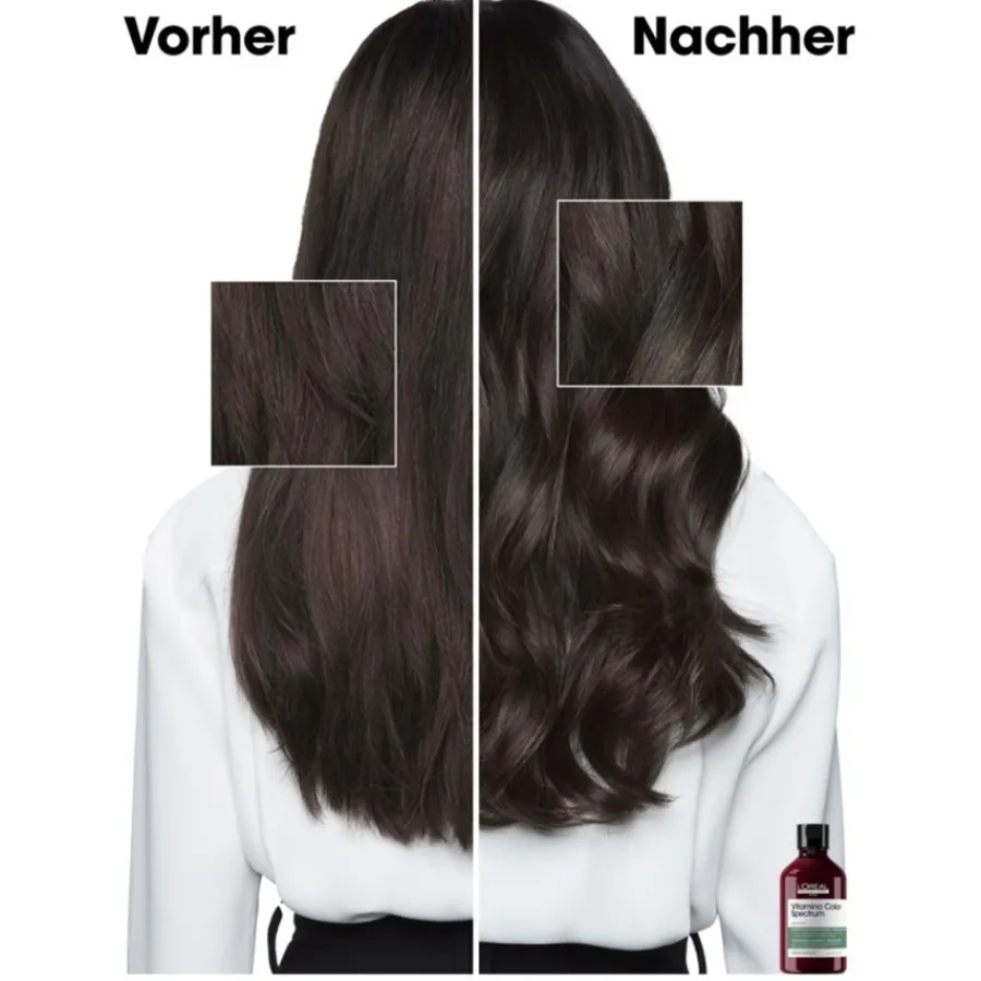 Het verzorgingsproduct uit de Expert Vitamino Color Spectrum-lijn, dat geschikt is voor alle haartypes, moet twee tot vijf minuten op nat haar worden aangebracht. De vegan hair care van het cosmeticahuis L’Oréal Professionnel Paris kan daarna worden uitgespoeld met veel water. Zelfs gekleurd en chemisch behandeld haar kan baat hebben bij een reiniging met de Green Dyes Neutralizing Shampoo uit het Expert Vitamino Color Spectrum assortiment. Dit haarverzorgingsproduct beschermt je haarkleur gedurende vele dagen.