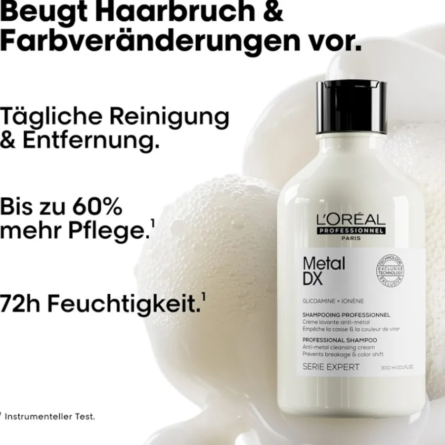 L’Oréal Professionnel Serie Expert Metal DX Professional Shampoo is speciaal ontwikkeld als een effectief haarverzorgingsproduct voor intensieve kleurbescherming vóór de volgende toepassing in de salon. Het voedt en verzacht het haar, behoudt de natuurlijke glans en zorgt ervoor dat de kleurbriljantie van je kleuring of ontkleuring aanzienlijk langer meegaat. Een bijpassende conditioner van dezelfde fabrikant is verkrijgbaar in onze online shop. Breng de shampoo aan op het haar en emulgeer tot er een rijk schuim ontstaat. Kort laten inwerken en daarna grondig uitspoelen.