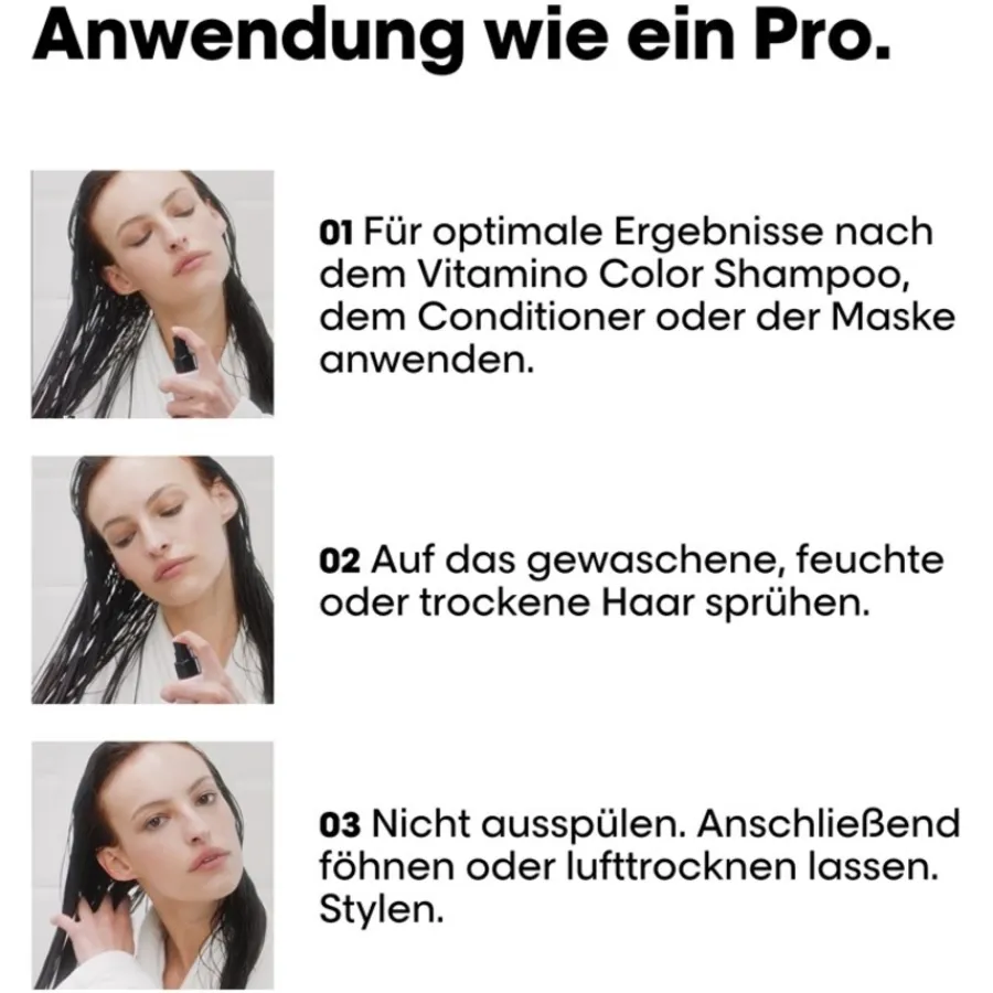 wordt aangebracht op gewassen, vochtig haar, waar de Vitamino Colour AOX formule van de “10 in 1 Perfecting Multi-Purpose Spray” van L’Oréal Professionnel het beste en meest effectief werkt.