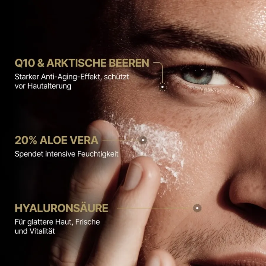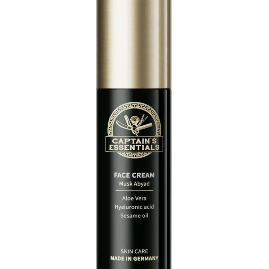 De Captain’s Essentials Musk Abyad Face Cream Premium huidverzorging bevat meer dan 20% aloë vera bladsap en hyaluronzuren met lange en korte ketens voor een antiverouderingseffect. Er wordt ook hoogwaardige sesamolie gebruikt voor een duurzame regeneratie en versterking van de huidcellen. De innovatieve huidverzorgingsformule biedt uitstekende bescherming voor je huid als een verkoelende en langdurige kalmerende gezichtscrème. De panthenol in de crème heeft ook een ontstekingsremmende en regenererende werking. De Q10 anti-ageing formule met arctische bessen en een natuurlijk mentholderivaat geeft je mannenhuid een dagelijkse oppepper! Natuurlijke suikerkelp heeft een celactiverende en hydraterende werking. Verwen jezelf en je omgeving met de heerlijk mannelijke Musk Abyad geur van deze crème.