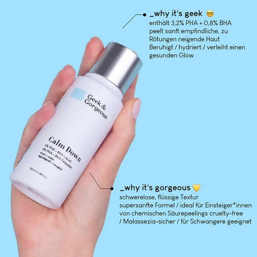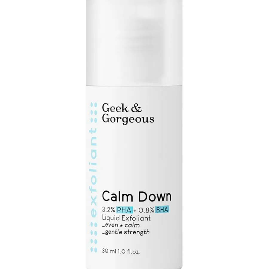 Het leven wordt steeds sneller. Zorgen begeleiden het dagelijks leven. Haasten van afspraak naar afspraak vermoeit lichaam en geest. De eisen van de werkgever worden steeds hoger. Gezins- en huishoudelijke taken putten niet alleen ons uithoudingsvermogen uit. De huid lijdt enorm onder de invloed van stress, die ook onze huid en vooral de gezichtshuid aantast door invloeden van buitenaf, zoals vrije radicalen. Met de Calm Down huidverzorgingsscrub van Geek & Gorgeous is de oplossing voor huidontspanning gevonden.Dit huidverzorgingsproduct bevat een combinatie van waardevolle, natuurlijke zuren en verschillende verzachtende, antioxiderende en hydraterende ingrediënten. De exfoliërende werking verwijdert op milde wijze huidbeschadigende stoffen, verwijdert oude huidcellen en stimuleert de vorming van nieuwe huidcellen. Tegelijkertijd heeft het een kalmerend, ontspannend en ontstekingsremmend effect op de huid.Of het nu gaat om een normale of gevoelige huid, een rode, geïrriteerde of onzuivere huid, de Calm Down huidpeeling biedt zachte huidverzorging voor dagelijks gebruik en een rondom mooie, gezonde en stralende teint.