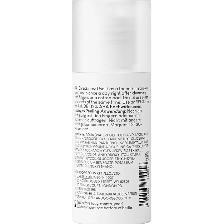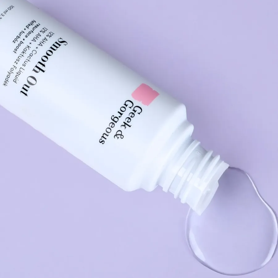 AHA-zuur werkt hier in een verhouding van 5:1 met een totale concentratie van 12%. Het exfoliërende zuur in Geek & Gorgeous Smooth Out Serum is geformuleerd met een pH-waarde van 3,5 tot 3,9, waardoor het zijn exfoliërende werking volledig kan ontwikkelen. Het exfoliërende effect verwijdert onder andere dode huidcellen, terwijl het AHA-zuur ook de poriën doorspoelt en de talg vloeibaar maakt, zodat het gemakkelijker kan wegvloeien. Het product kan ook hyperpigmentatie verlichten en oppervlakkige expressielijntjes verbeteren. Het geeft de huid ook een natuurlijke gloed.