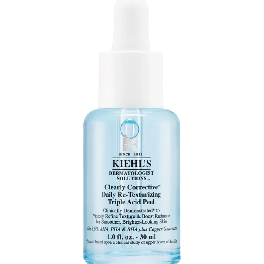 De Clearly Corrective Daily Re-Texturising Triple Acid Peel van Kiehl’s is een gezichtspeeling die is ontwikkeld als een pre-serum voor de dagelijkse routine. De formule is gericht op het verfijnen van de textuur van de huid. De samenstelling combineert verschillende zuren: glycolzuur en melkzuur (AHA’s) en gluconolacton (PHA) dienen als exfoliërende ingrediënten die kunnen bijdragen aan een gladder huidoppervlak. Salicylzuur (BHA) wordt aan het mengsel toegevoegd en kopergluconaat rondt de formule af. Het pre-serum is bedoeld voor dagelijks gebruik, ’s ochtends en ’s avonds, en kan bijdragen aan een egalere teint. Toepassing is niet beperkt tot het gezicht, maar kan ook worden uitgebreid naar gebieden zoals de borst en handen. Bij gebruik van producten met zuren wordt dagelijks gebruik van een zonnebrandcrème aanbevolen.</p