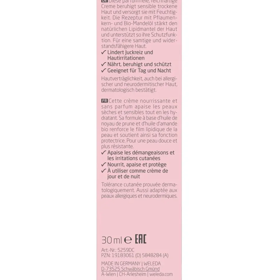 Amandel gezichtscrème harmoniseert de huidfunctie door de lipidenlaag te stabiliseren. Het bevat goed verdragen amandelolie met een bijzonder hoog gehalte aan onverzadigde vetzuren. Amandelolie is geschikt voor de verzorging van de gevoelige, ruwe, schilferige en droge huid. Het wordt ook regelmatig gebruikt in de verzorging van baby’s en peuters. Amandel Gevoelige Gezichtscrème breng je elke ochtend aan op een gereinigde huid. Verdeel deze dagcrème spaarzaam over gezicht, hals en decolleté. Kijk ook eens naar Weleda’s Soothing Moisturiser, die is ontwikkeld voor de gevoelige gecombineerde huid!