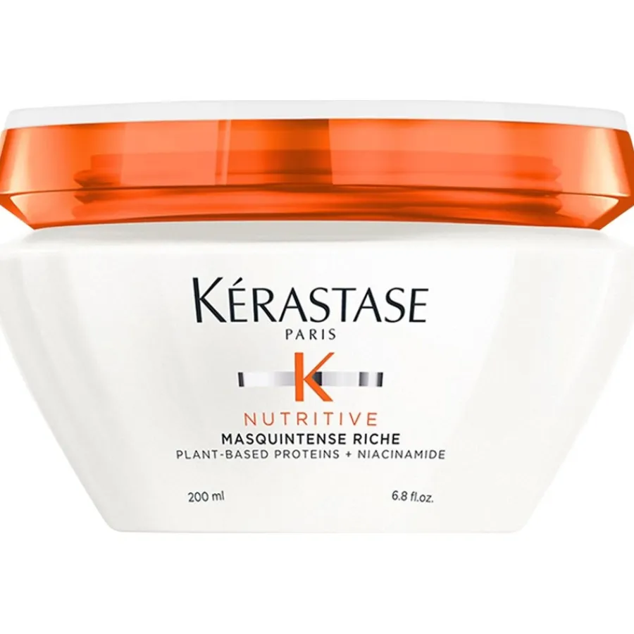 Het Masquintense Riche haarmasker van Kérastase is geformuleerd met anti-uitdroog polymeren om het haar te voeden zonder het te verzwaren. Het bevat plantaardige proteïnen uit tarwe, maïs en soja, die fungeren als voedingssupplement. Samen met vetzuren en vitaminen levert het essentiële voedingsstoffen. Niacinamide versterkt de haarvezel van binnenuit, terwijl perfect gedoseerde lipiden en glycerine zorgen voor een uitzonderlijk voedende, romige textuur die glans en soepelheid geeft en gespleten haarpunten aanzienlijk helpt te verminderen.Gebruik: Knijp overtollig water eruit na het wassen. Breng het haarmasker aan op de lengten en punten, vermijd de wortels. Laat 5 minuten intrekken, emulgeer met een beetje water en spoel grondig uit.
