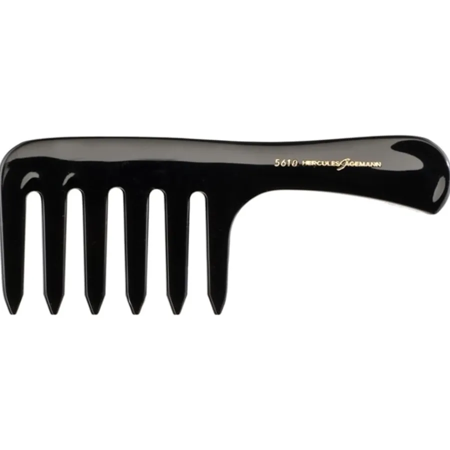 De elegante zakhandvatkam model 5610 is uitgerust met extra brede tanden, die het ook mogelijk maken om bijvoorbeeld het haar te ontwarren. Vooral lang haar heeft hier vaak last van. Het gladde maar flexibele materiaal kamt en verzorgt het haar zacht en geeft het een luxueuze glans. De zacht afgeronde tanden zorgen voor een extra massage van de hoofdhuid. De naam van het label en de productnaam zijn in goud geschreven op het goed gevormde handvat.De haarborstels en kammen van Hercules Sägemann worden geproduceerd door de New-York Hamburger Gummi-Waaren Compagnie (NYH) in Hamburg, een bedrijf dat gespecialiseerd is in de productie van professionele apparatuur voor kapsalons. De kammen met fijne handgrepen en andere producten zijn populair bij professionals over de hele wereld.